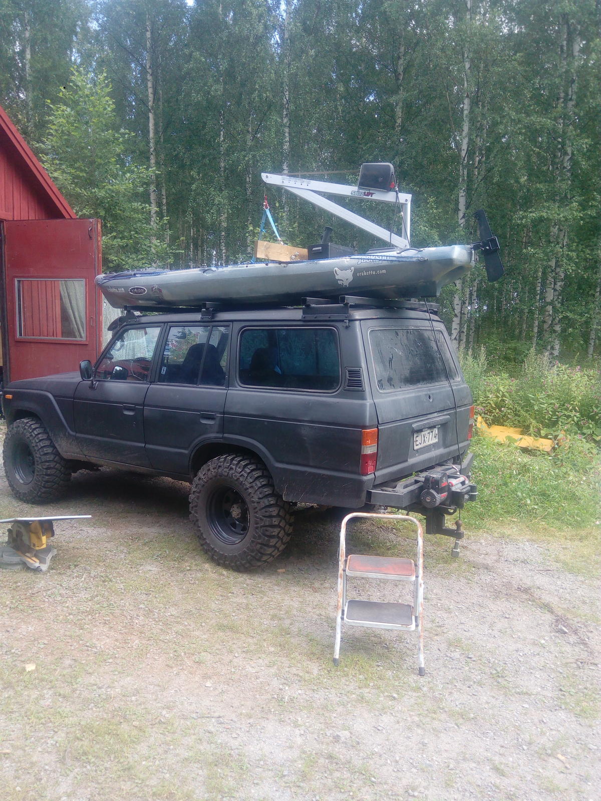 Sallittu kattokuorma 220 kg. Runko ja nosturi alle 100 kg. Enimmäkseen kuljetetaan kalastuskajakkia joka painaa 60 kg.