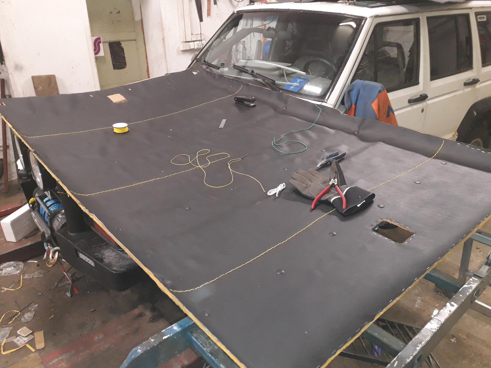 Pari viikkoa sitten tein kattoverhoilun uusiksi. Alkoi menemään hermot kun vanha repaleinen pappakalsari kangas irtosi aina liimauksesta ja roikkuvat repaleet hinkkasi päätä kun ajeli. Liimasin nahan kolmella eri liimalla kattoon. Ajatuksena että joku toimisi. Hyvältä näytti kun sain nahan liimattua. Kävin kahvilla ja tulin takaisin talliin ni nahka oli, kuin perunapelto. Epätoivoisena kokeilin muovisia sisustustulppia, mutta ne ei vakuuttanut. No ei auttanut ku tehdä neula rautanaulasta ja tallista löytyi keltaista linjalankaa.