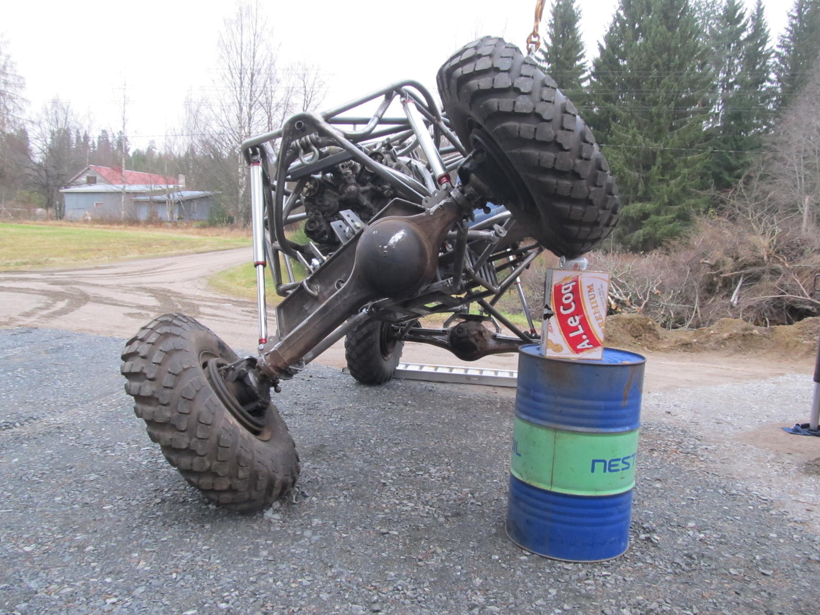 Ei tuu tästä kevyttä peliä.. 3t painaa varmasti ku pelkät akselit näillä renkailla painaa sen 1300kg. Tuskin keveneekää ku laittaa jotkut 130cm traktorin kumit