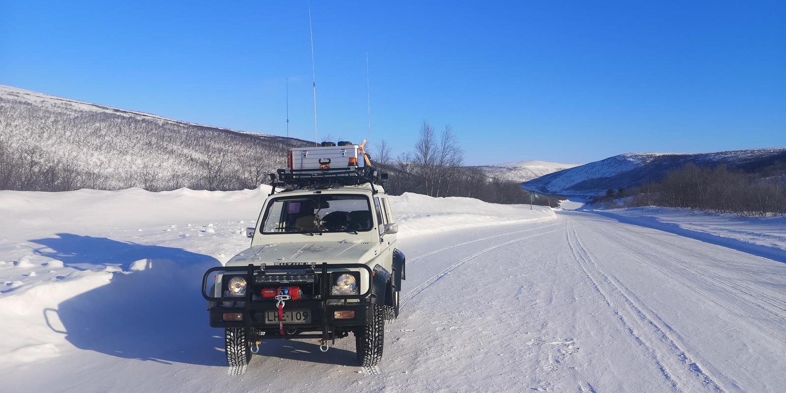 Autossa on myös kattava määrä radioita ja piiskoja: LA-puhelin, APRS-lähetin ja vhf/uhf radio. Mukana tulee myös pakolliset leirikamat, vaelluskota, kamiina ja työkalut. Kuvassa vielä talvinakit päällä, uudenkarheat mutakumit sekä raptorin 2.5" korotussarja odottelee kesän tuloa tänne peräpohjolaan.