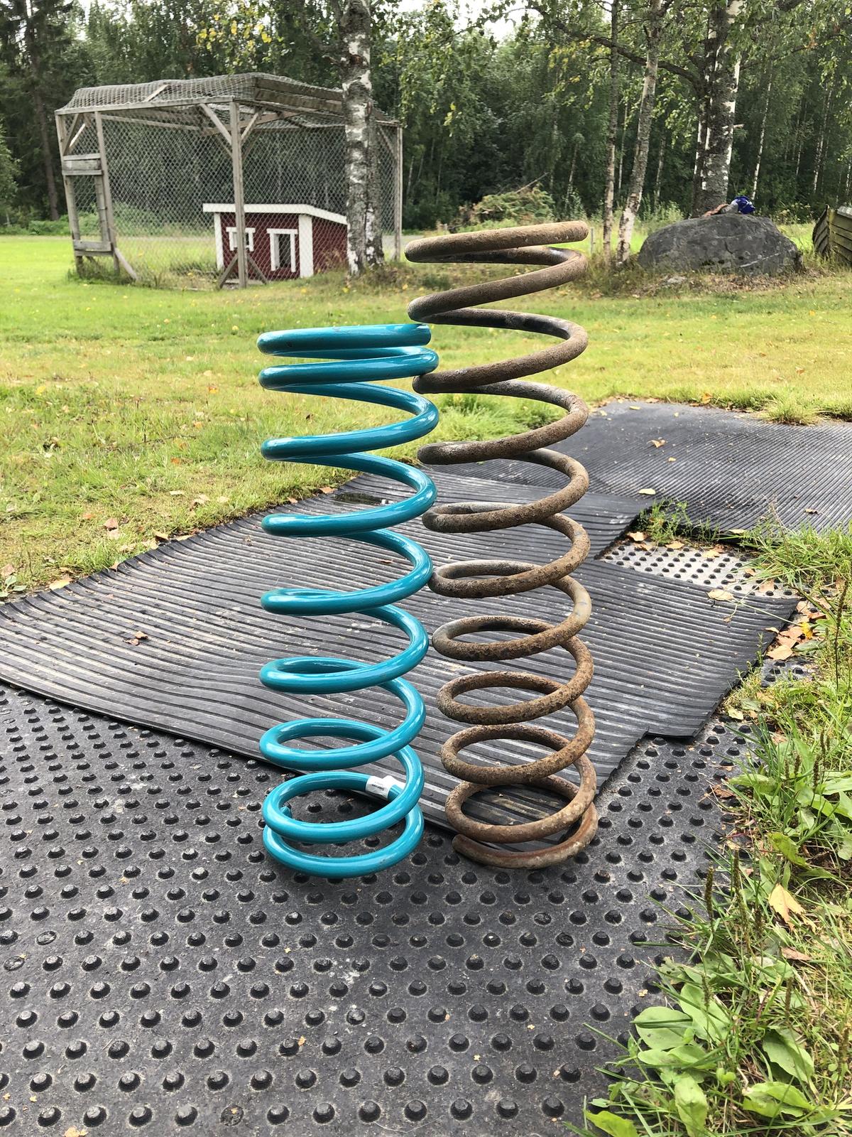 Nytpä on auto kasassa. Etujouset olikin aika jännät, orkkikset oli sen 50mm korkeemmat.. mutta kyllä se ihan nätisti asettui. Ja hyvä ajaa tielläkin, enkä varsinaista pintakovuuttakaan rekisteröinyt, johtuu varmaan tonnin painoisista renkaista