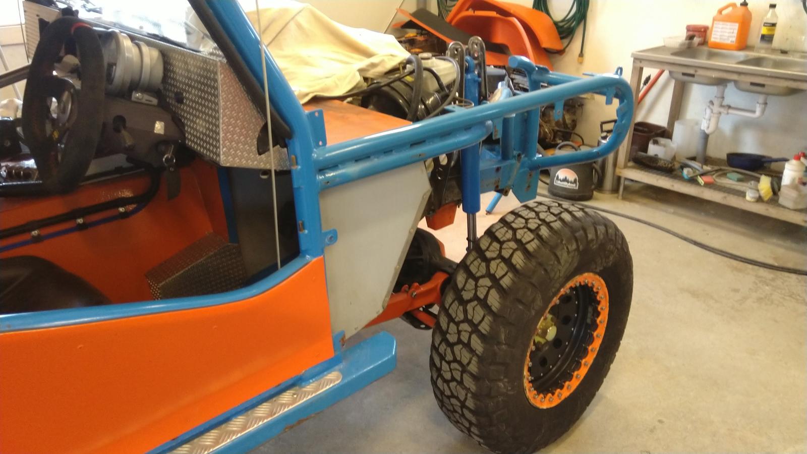 Kyllä ne kaikki paikoilleen mahtui. Ulosjoustoja ois saanu enemmänkin, mutta edessä vetää panhardi akselin jo niin sivuun etten laittanut enempää. Takana taas A linkin kuula on ääriasennossa, eikä kardaanikaan taivu enempään.