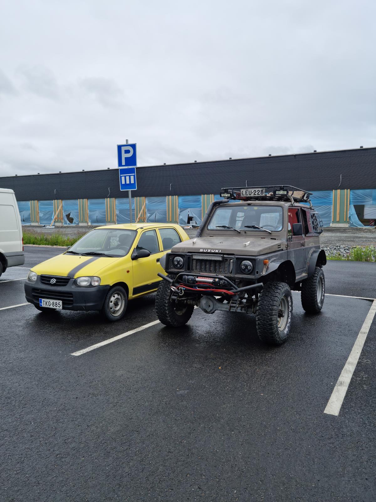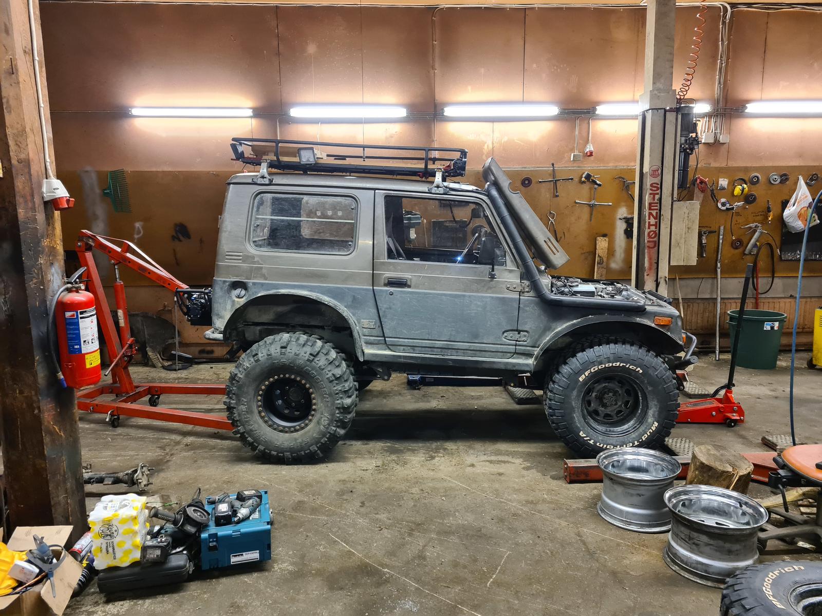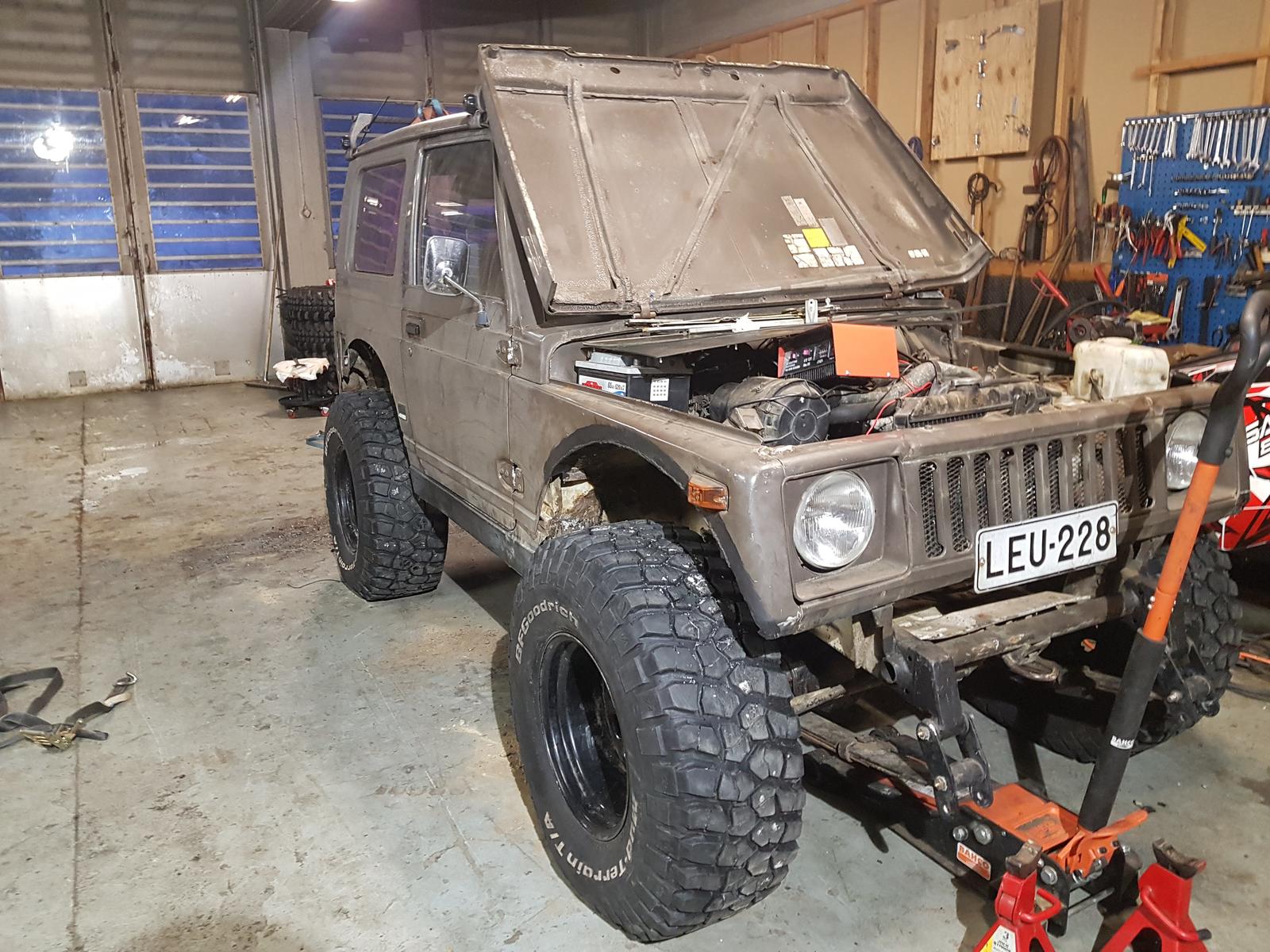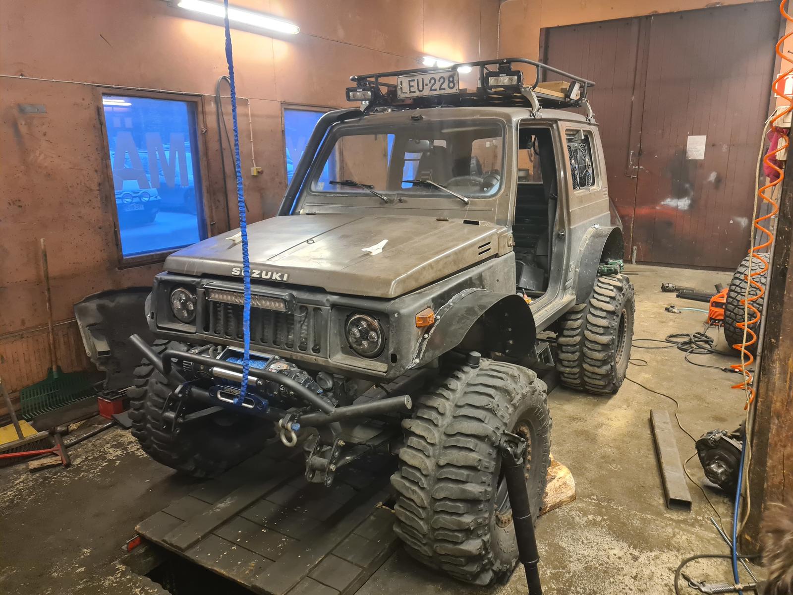 Sj410 1.6 16v automaatti toyotan akseleillaHei. Tässä on tullu harrastettua tuota suzukia jo jonkin aikaa ja ajattelin pikkusen kirjotella. Lähtökohtana oli tuollainen halvin mahdollinen Sj410. Aluksi ostin siihen 31x10.5x15 rattaat, ja eihän ne tietenkään mahtunu pyöriin. Joten rälläkkä käyntiin ja kaaret uusiksi, samalla vaihtui alusta. Sitten keksin että 10x15 et-44 vanteelle ei 10.5 leveä rengas ole sopiva, joten renkaat vaihtui 33x12.5x15 mutikoihin. Kun kaaria tuli vähän avarrettua niin piti se koko koppaki hitsailla asiallisempaan kuntoon, ja samalla tuli palkkihelmat. Alusta asti tekniikka oli tarkoitus vaihtaa, ja tekniikaksi valikoitui 1.3 16v 2001 balenon tupla kateilla varustettu G13BB. Tässä siis paikallaan sj413sen öljypohja ja moottorikorvalliset. Ja perässä Sj413sen laatikko. Balenon vakio pakosarja modattiin ja imusarjaksi vaihdettiin Jimnyn sarja jotta homma olisi vesiletkujen ja pakoputken osalta bolt-on tyyppisempää. Myös puskurit tuli samalla tehtyä semmoset että vinssinkin saa paikalleen. Ja viimein koitti hetki että auto oli leimaa vaille "valmis" Ja leima tuli laakista. Ensimmäisellä safarilla sitten koeponnistettiin autoa. Hyvin muuten pelasi, mutta syyläri osottautui pieneksi, oli vanha sj410 mallinen bilteman 10" puhaltavaksi laitetulla flektillä. Safarivarusteita lisätty sitä mukaa ku on ollu tarvetta. Elkkä 2" jenkkimallin vetokoukku ja safariteline tuli laiteltua ja samalla garminin GPS. Sitten tuli snorkkelia ja myös syyläri vaihtui honda civicin alujäähyyn ja flekti edelleen puhaltava mutta spallin noin 1000 kuutiota pukkaava malli. Sitten oltiinkin valmiita Raajärvelle ja Lapland Trophyyn. LT:stä jäi käteen hyvä reissu, mutta autosta löytyi myös huonosti toimiva vinssi. Vinssille tehtiin täysremontti, jossa meni vaihtoon kaikki johdot ja rele, tämän jälkeen alkoi olemaan melkoisesti vinssissä tehoja. LT:n jälkeen alkoi pikkusen enemmän polttelemaan sitten lukolliset akselit. Ja muutenkin pieniä jatkojalostamisen tarpeita löytyi. Purkasin yhtenä viikonloppuna kaksi autoa: LN65 hilux josta akselit ja sitten toinen baleno josta moottori. Tässä vaiheessa oli jo hankittuna automaattilaatikkokin peräisin vitarasta. Näistä ensimmäisenä työnalle meni laatikko ja moottori setupin vaihtaminen. Laatikoksi tuli 03-72LE eli vitaran 4 vaihteinen sähköohjattu malli. Moottorin ja vaihteiston vaihtoon liittyi sitten kummankin johtosarjan sovittaminen, kepin modaus, tunnelin modaus ja välikardaanin rakenteleminen. Jotta homma ei olisi ollut kovin pitkä operaatio, niin päätettiin tehdä homma yhdessä viikonlopussa. Savotta aloitettiin perjantaina aamulla 08.00 ja ajelin sitten töihin maanantai aamuna uudella tekniikalla. Tekniikan vaihdon jälkeen sattui löytymään 2000luvun alun 911 porschen penkit edullisesti, ja vanhat penkit oli jostain 600tkm ajetusta L200sesta mitsusta. Joten eivät olleet enää kovin ryhdissään. Muutos ajomukavuudesssa tuntui häntäluussakin pikkuisen hellittäneenä pakotuksen tunteena 200km siirtymillä. Sitten tällä setupilla käytiin Psoryn kuurankierto kahlaamassa lainarenkailla. Ja täytyy sanoa että 31x10.5x15 special trackit oli aika positiivinen yllätys lumessa, varsinkin kun vertaa 33x12.5x15siin yli kymmenen vuotta vanhoihin mutikoihin. Tältä raajärven matkalta jäi sitten kotiin tuomisiksi 5 kappaletta tulevia suzukin renkaita 6x6 volvosta. Kokona 35x16x15 beadlock vanteilla ja aika erikoisella et:llä ja jaolla. Näihin joutuu sitten keskiöt vaihtaan.