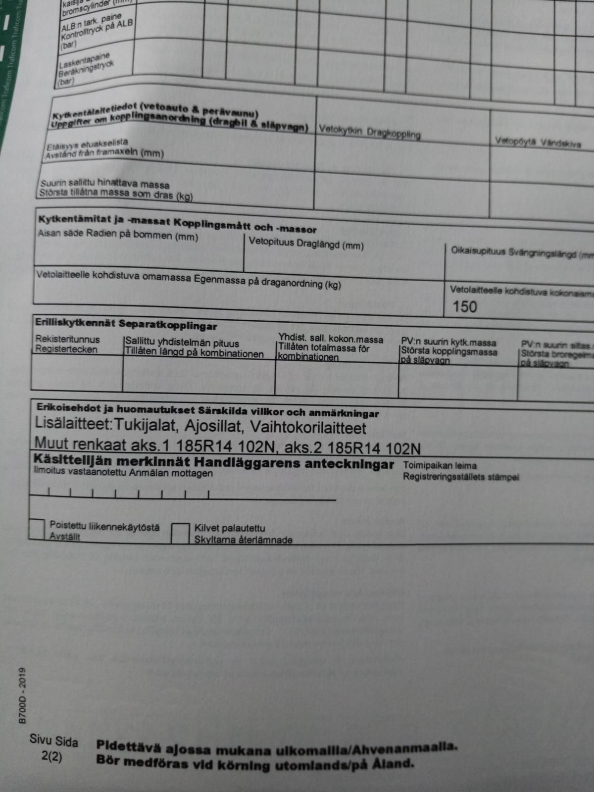Kantavuus ilman lavaa 2410 kg. Katsuri meinas että on ainoa rekisterissä oleva henkilöauton koukkulaiteperävaunu