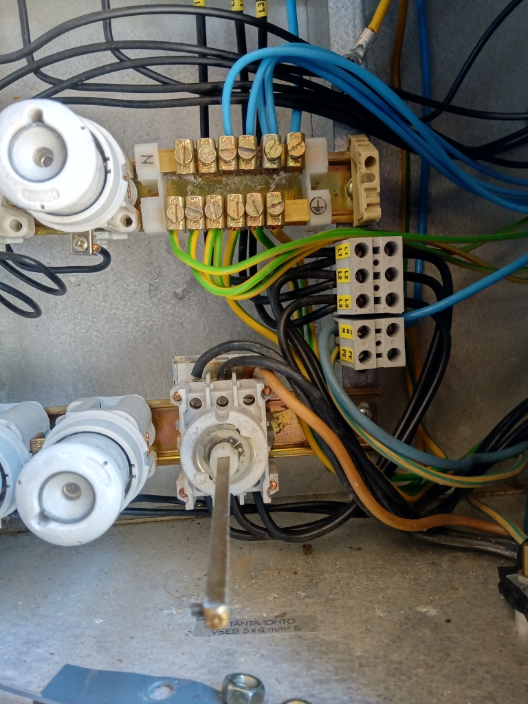 Lisää mielenkiintoa asiaan saa siten, että toi laatikko on toisen pienemmän kytkinkaapin perässä. Eli tota ennen on kaappi, jossa on katkaisija ja sulakkeet. Siinä boksissa on talolta tuleva kaapeli, josta lähtee sulakkeen kautta 3 vaihetta ja nolla tonne työmaaboksille. Ja siinä kovasti näyttää siltä, että nolla on yhdistetty kiskoon, joka maadoittaa pikkuboksin. Työmaaboksilta tuleva keltavihreä ei ole kytketty tossa pikkulaatikossa mihinkään. Eikä rungon vaiheistuminen koske tuota boksia, siinä hehkuu omasta mielestäni kynä vain vaihejohtimissa.