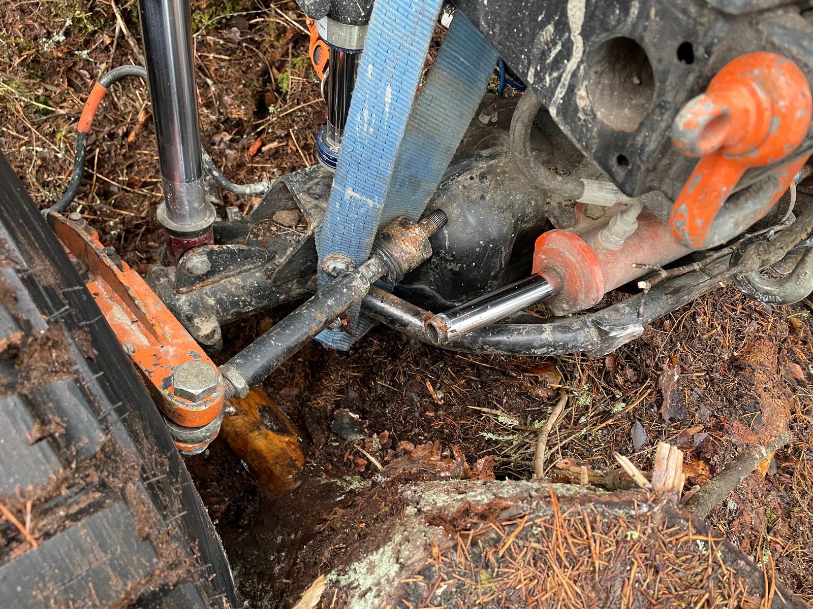 Tuossa ehdottamassani tavassa olisi sylinteri tasan vaakatasossa sektorivarren liikeradan kanssa, Letkut olisivat lyhyet ja täysin liikkumattomat ja suojassa oksilta ym. ym. Tuolla akselin takana murikan ja raidetangon välissä myös hyvin suojassa, ja ehkä parhaiten keventäisi pallonivelten ja simpukan rasitusta. Sieltä taas letkut olisivat pitkien liikeratojen vuoksi alttiina erilaisille vaurioille.
