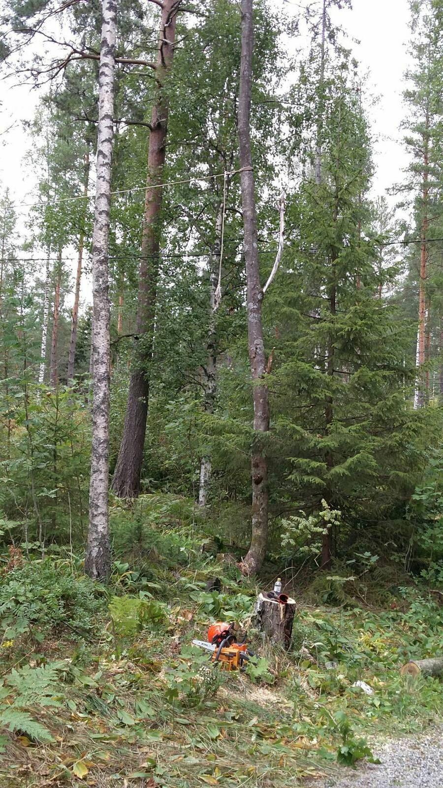 Loppukesästä kundin (Maken) kanssa poistettiin muutama sähkölinjaa uhkaava puu. Vielä oli kultahampaissa purua jäljellä. Viimeisessä kuvassa oma suosikkityökaluni Stihl MSA140 patterisaha. Painaa vain 2.6kg. Keveytensä johdosta hyvä peli karsinnassa. Raivaus tyyppisessä hommassa missä joutuu välillä vetelemään rankoja hyvä ominaisuus kun ei papata jaloissa.