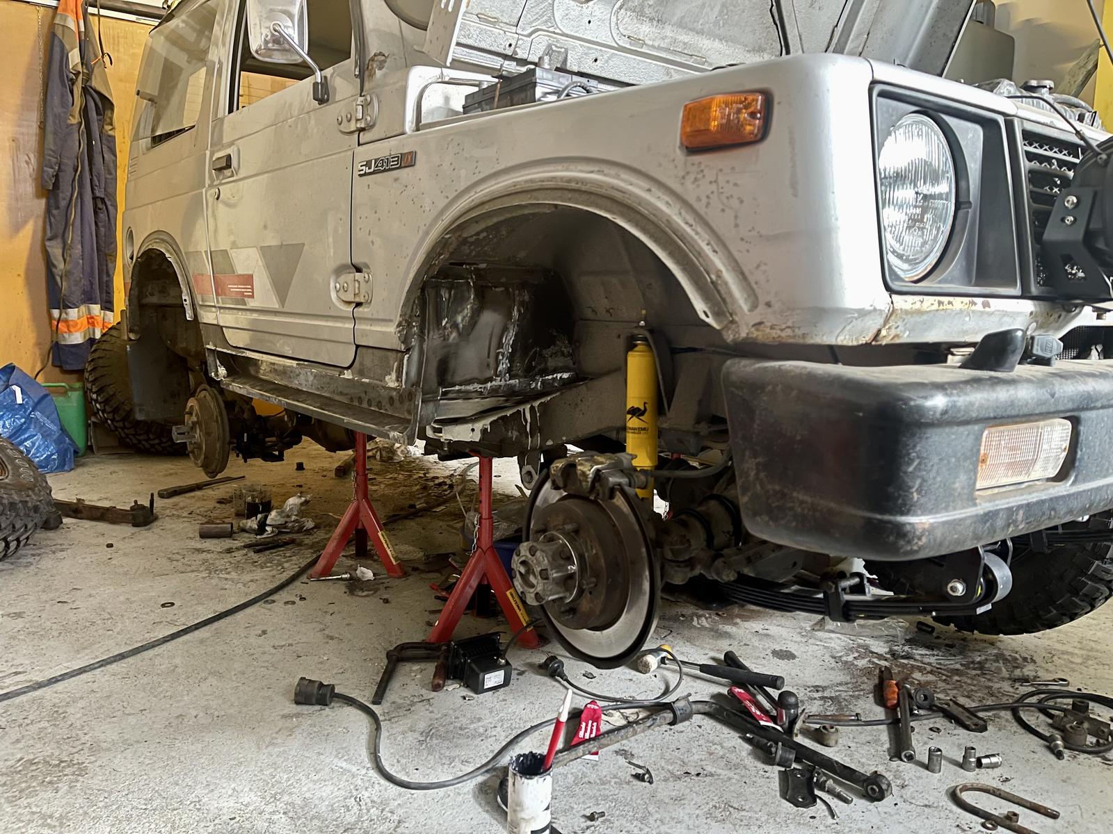 Alustaan tuli laitettua uutta osaa ja samalla tuli pikku takapakki projektin osalta. Uusien takapään u-pulttien kiristämisen jälkeen ilmestyi öljylammikko auton alle. Jossakin vaiheessa joku edellisistä omistajista oli paikannut kemiskillä mystisen lahovian akselin kummassakin päässä ja nytten pultteja kiristäessä lohkesi paikat irti. Tässä olen nytten miettiny, että koittaisiko putkittaa akselin uudelleen, jos ei ala löytymään uutta akselia mistään pian. Jos vähäänkään tuntuu, että on pakottava tarve päästä sj413 taka akselista eroon, niin mielelläni lunastaisin pois |