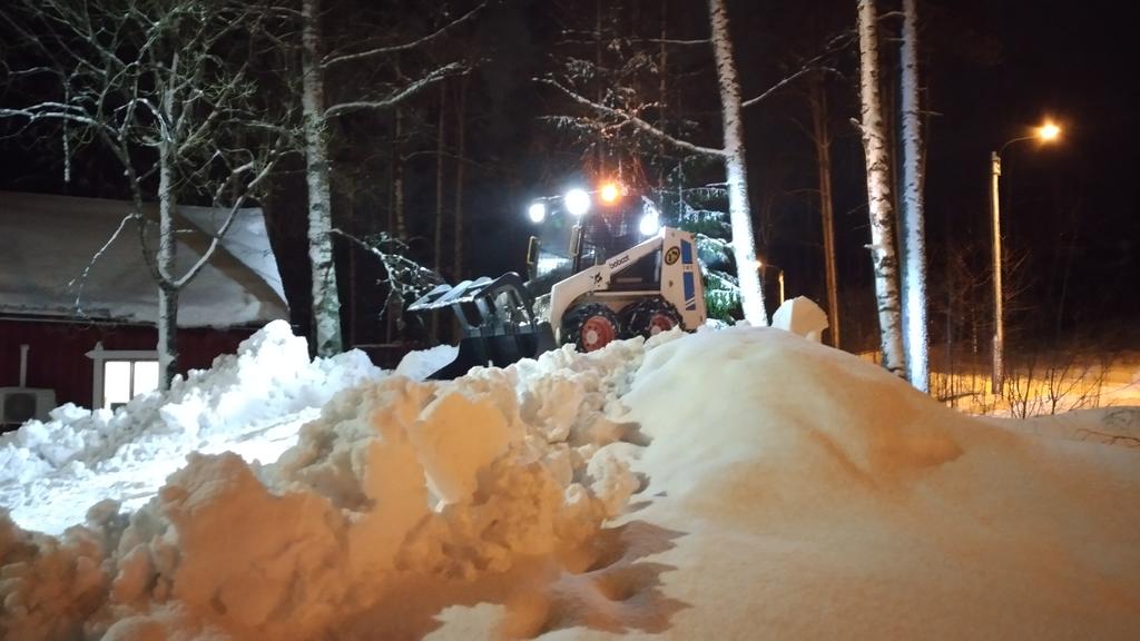 Pelaa. Kaksi kattolumikeikkaa eilen. Tarkemmin katolta alas tulleiden lumien lemppausta.