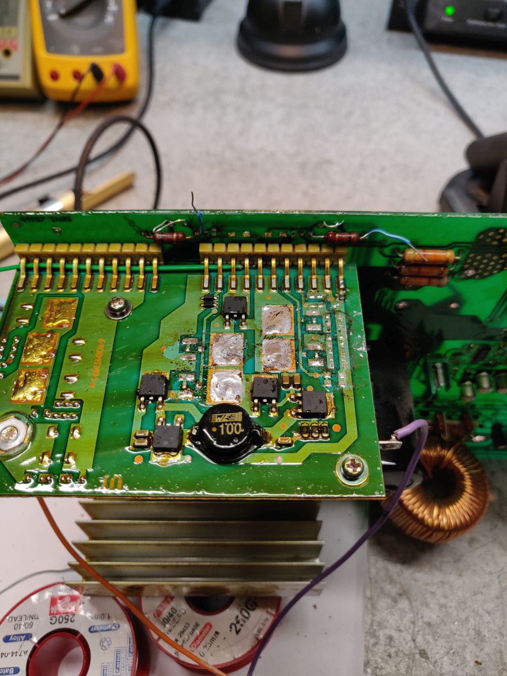 Korjauksen kannalta erityisen vaikea rakenne. Invertterin input- ja output tehoelektroniikka rakennettu alumiinipohjaiselle piirilevyille. Kortit sitten liimattu jäähdytysripoihin. Liimaus kyllä irtosi, mutta tollasessa alumiinilevyssä on niin suuri lämmönjohtavuus, että tavallisilla kolveilla turha yrittää irroittaa mitään tuosta levystä. Lisähaitta vielä, että koko paska kastettu lakkaan mikä ei tunnu liukenevan mihinkään. Ei auta kuin mekaanisesti rapsutella vaihdettavat osat esiin. Tuo lakkakerros vaikeuttaa myös tunnistusta useimmissa nykyosissa kun ne vähätkin merkinnät on poltettu laserilla epoksin pintaan. Lakkakerros päällä tekee merkinnät näkymättömiksi.
