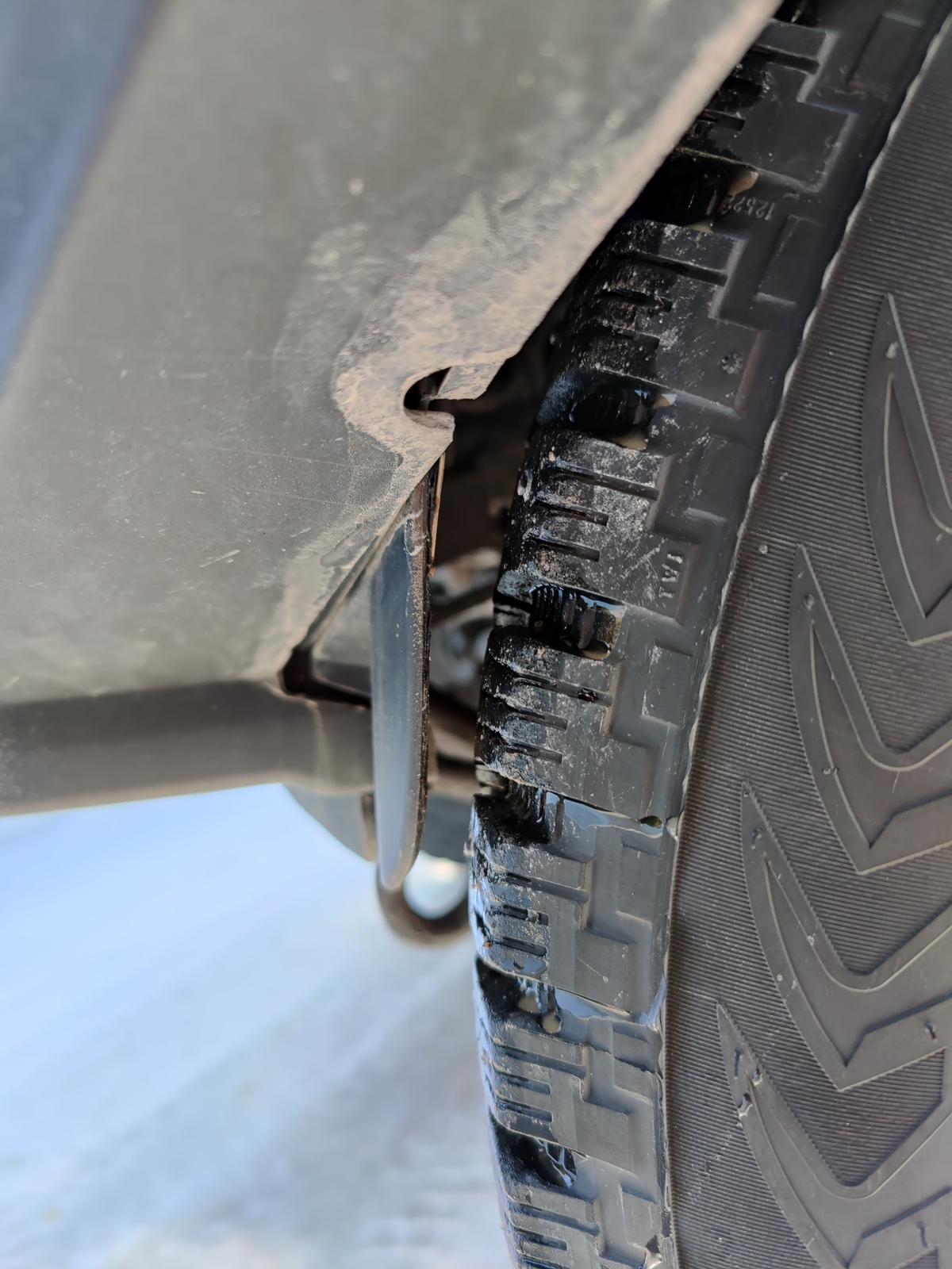 Edessä oleva läppä tosiaankin ensimmäisenä ottamassa renkaaseen käännettäessä. Läppää todennäköisesti helppo taivuttaa kuumailmapuhaltimen avulla. Kuvassa oman korotetun Jimnyn 235/75r15 Nokialainen 0et vanteella tasaisella renkaat käännettynä. Väliä jää n.10mm.