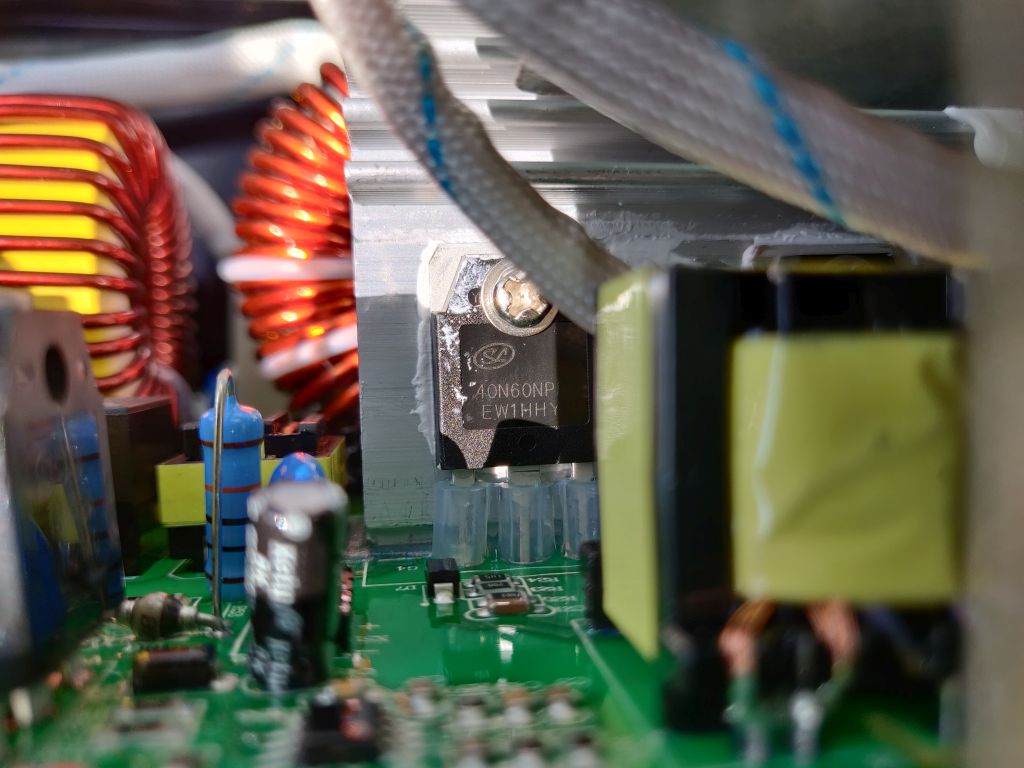 Liiterin plasmaPiirilevy pohjapuolelta. Ihan professionaalin näköinen. Pinta/ryömintä välejä muutettu kriittisissä paikoissa ilmaväleiksi jyrsimällä piirilevyyn hahloja. Kaikkia transistoreja ei näkynyt, mutta oletan niiden olevan samanlaisia. 40N60 on siitä mielenkiintoinen tyyppi, että samalla tyypillä löytyy sekä MOSFETtejä, että IGBT transistoreja. No kumi tahansa niin speksit 600V 40A eli aika jytkyjä. Transistorin jaloissa muovihylsyt todennäköisesti estämässä läpilyöntiä jos (kun) masiina likaantuu. |