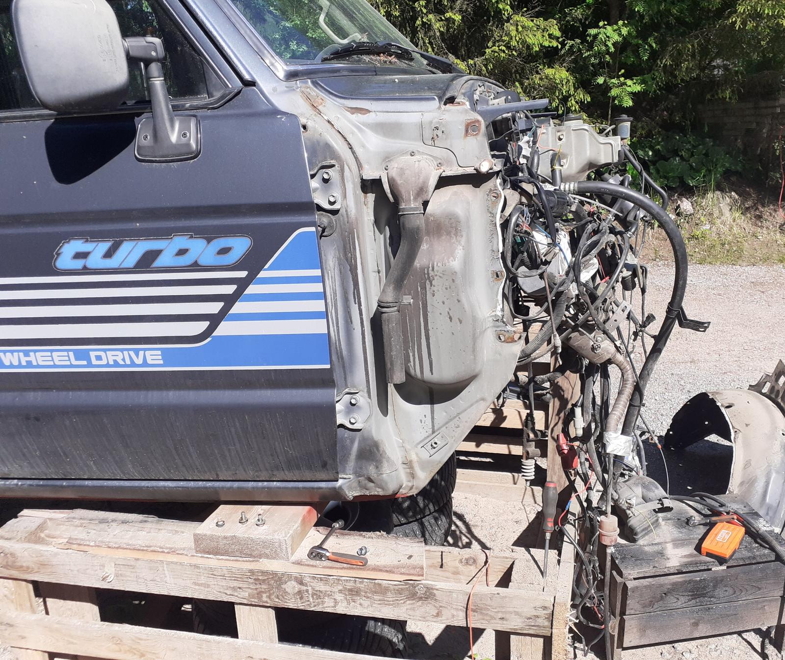 Niin siinä kävi vähän sillein että talvella alotin kyseleen asiasta hintaaki kyselin ja siitä sitten säännöllisen epäsäännöllisesti kysyin auton tilanteesta viimein tuotti tulosta ja päästiin kauppoihin Hyvä oli itse ostaa kun ei missään ollu julkisesti myynnissä niin ei syntynyt vasta kilpailua Tämän kohtalo kyllä on jäädä ulkosin puolin samaan näköön kaikki pienen pienetkin ruoste vauriot korjaan pois ja mitä nyt tuo arb puskuri tuli keulaan ja korotetaan jousituksella vähän ei tule soa ja koppaa maksimi 50mm ja puskurit nostetaan kans sama verran ja teipot jää kylkiin kun ylimaalaus ei tule kysymykseenkään niin kauan kun tuo minulla on
