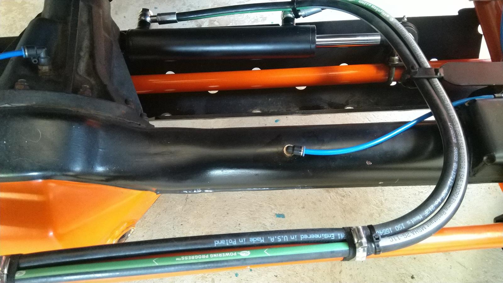 Paikallisesta konekorjaamosta letkut, ja systeemin lopullinen kasaus. En oikein tykkää noista letkuklemmareista tossa panhardtangossa, mutta en keksinyt parempaakaan kiinnitys systeemiä. Täytyy katsella tarviiko vaihtaa toi tehostajan öljysäiliö suurempaan, kone sammuksissa jos ripeämmin kääntelee rattia, röyhtäsee se öljyä pihalle, muutoin tuntuu toimivan ok. Kone sammuksissa tietenkin raskaampi kuin ennen, mutta koneen käydessä mukava käännellä paikallaan, jotainhan se varmaan sieltä rikkoo mutta katellaan nyt. Ton enempää ei pysty vielä sanomaan ennen kun pääsee kunnolla testaamaan.
