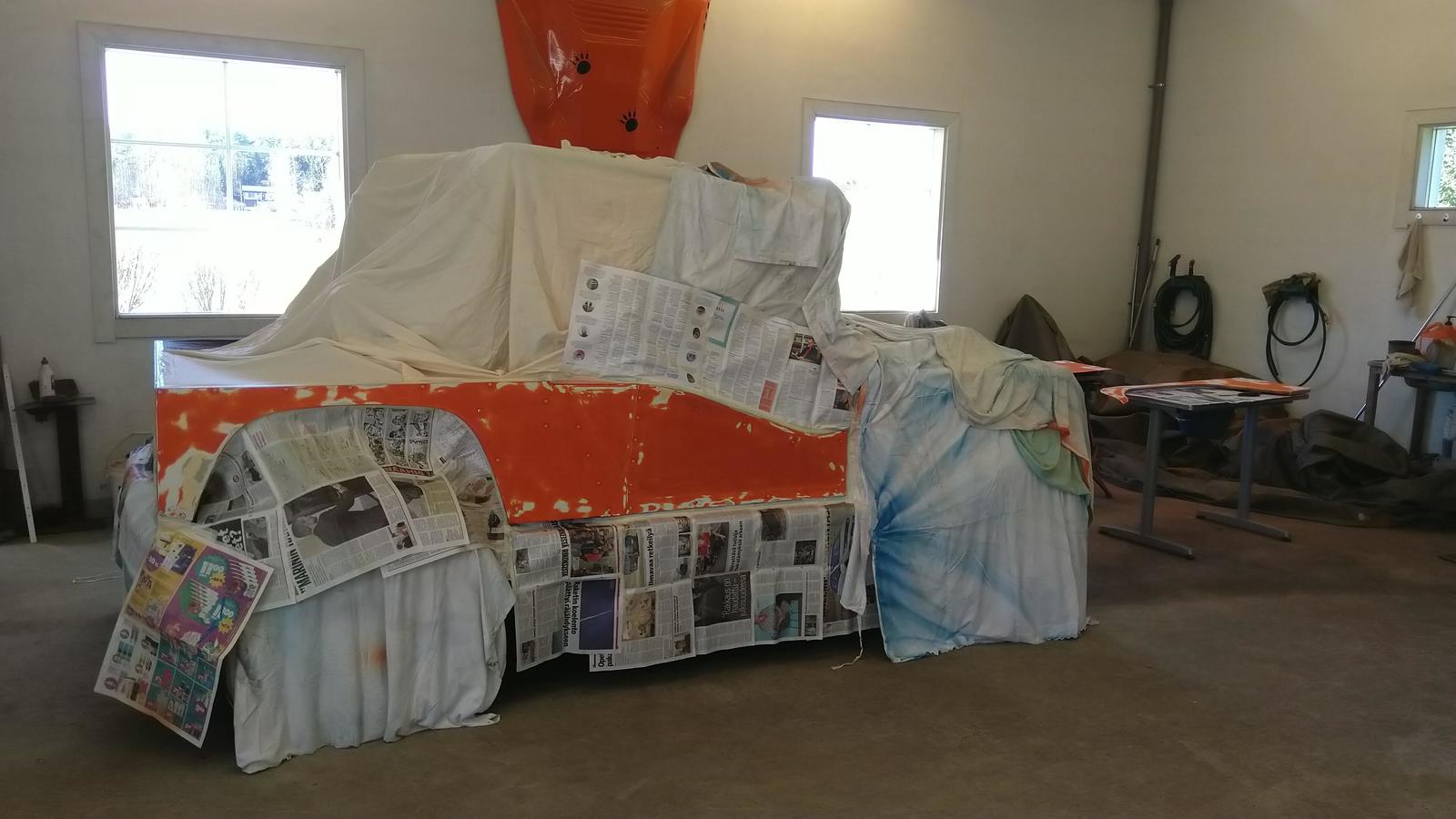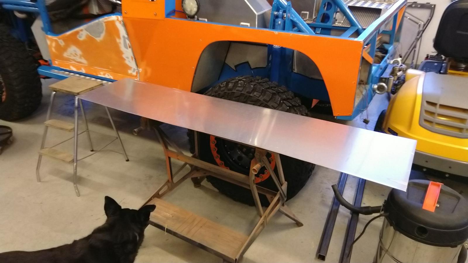 Kesällä käytin tuota hieman kyljellään ja nyt oli aika hieman korjailla siitä syntyneitä jälkiä. Hydraulipumpulla tuon oviaukon putken oikaisu, pintapellin suoraksi naputtelu ja paikoilleen asennus. Siniset osat jo maalailinkin, oranssit jäi odotteleen. Aloittelin hieman jo tuon peräpellin tekemistä, vanhan olin jo oikaissut lukemattomia kertoja ja oli jo niin venynyt joten nyt käytin neitseellistä palaa