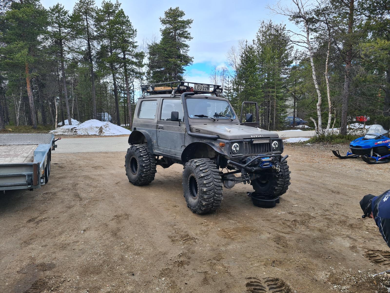 Sj410 1.6 16v automaatti toyotan akseleillaHei. Tässä on tullu harrastettua tuota suzukia jo jonkin aikaa ja ajattelin pikkusen kirjotella. Lähtökohtana oli tuollainen halvin mahdollinen Sj410. Aluksi ostin siihen 31x10.5x15 rattaat, ja eihän ne tietenkään mahtunu pyöriin. Joten rälläkkä käyntiin ja kaaret uusiksi, samalla vaihtui alusta. Sitten keksin että 10x15 et-44 vanteelle ei 10.5 leveä rengas ole sopiva, joten renkaat vaihtui 33x12.5x15 mutikoihin. Kun kaaria tuli vähän avarrettua niin piti se koko koppaki hitsailla asiallisempaan kuntoon, ja samalla tuli palkkihelmat. Alusta asti tekniikka oli tarkoitus vaihtaa, ja tekniikaksi valikoitui 1.3 16v 2001 balenon tupla kateilla varustettu G13BB. Tässä siis paikallaan sj413sen öljypohja ja moottorikorvalliset. Ja perässä Sj413sen laatikko. Balenon vakio pakosarja modattiin ja imusarjaksi vaihdettiin Jimnyn sarja jotta homma olisi vesiletkujen ja pakoputken osalta bolt-on tyyppisempää. Myös puskurit tuli samalla tehtyä semmoset että vinssinkin saa paikalleen. Ja viimein koitti hetki että auto oli leimaa vaille "valmis" Ja leima tuli laakista. Ensimmäisellä safarilla sitten koeponnistettiin autoa. Hyvin muuten pelasi, mutta syyläri osottautui pieneksi, oli vanha sj410 mallinen bilteman 10" puhaltavaksi laitetulla flektillä. Safarivarusteita lisätty sitä mukaa ku on ollu tarvetta. Elkkä 2" jenkkimallin vetokoukku ja safariteline tuli laiteltua ja samalla garminin GPS. Sitten tuli snorkkelia ja myös syyläri vaihtui honda civicin alujäähyyn ja flekti edelleen puhaltava mutta spallin noin 1000 kuutiota pukkaava malli. Sitten oltiinkin valmiita Raajärvelle ja Lapland Trophyyn. LT:stä jäi käteen hyvä reissu, mutta autosta löytyi myös huonosti toimiva vinssi. Vinssille tehtiin täysremontti, jossa meni vaihtoon kaikki johdot ja rele, tämän jälkeen alkoi olemaan melkoisesti vinssissä tehoja. LT:n jälkeen alkoi pikkusen enemmän polttelemaan sitten lukolliset akselit. Ja muutenkin pieniä jatkojalostamisen tarpeita löytyi. Purkasin yhtenä viikonloppuna kaksi autoa: LN65 hilux josta akselit ja sitten toinen baleno josta moottori. Tässä vaiheessa oli jo hankittuna automaattilaatikkokin peräisin vitarasta. Näistä ensimmäisenä työnalle meni laatikko ja moottori setupin vaihtaminen. Laatikoksi tuli 03-72LE eli vitaran 4 vaihteinen sähköohjattu malli. Moottorin ja vaihteiston vaihtoon liittyi sitten kummankin johtosarjan sovittaminen, kepin modaus, tunnelin modaus ja välikardaanin rakenteleminen. Jotta homma ei olisi ollut kovin pitkä operaatio, niin päätettiin tehdä homma yhdessä viikonlopussa. Savotta aloitettiin perjantaina aamulla 08.00 ja ajelin sitten töihin maanantai aamuna uudella tekniikalla. Tekniikan vaihdon jälkeen sattui löytymään 2000luvun alun 911 porschen penkit edullisesti, ja vanhat penkit oli jostain 600tkm ajetusta L200sesta mitsusta. Joten eivät olleet enää kovin ryhdissään. Muutos ajomukavuudesssa tuntui häntäluussakin pikkuisen hellittäneenä pakotuksen tunteena 200km siirtymillä. Sitten tällä setupilla käytiin Psoryn kuurankierto kahlaamassa lainarenkailla. Ja täytyy sanoa että 31x10.5x15 special trackit oli aika positiivinen yllätys lumessa, varsinkin kun vertaa 33x12.5x15siin yli kymmenen vuotta vanhoihin mutikoihin. Tältä raajärven matkalta jäi sitten kotiin tuomisiksi 5 kappaletta tulevia suzukin renkaita 6x6 volvosta. Kokona 35x16x15 beadlock vanteilla ja aika erikoisella et:llä ja jaolla. Näihin joutuu sitten keskiöt vaihtaan.