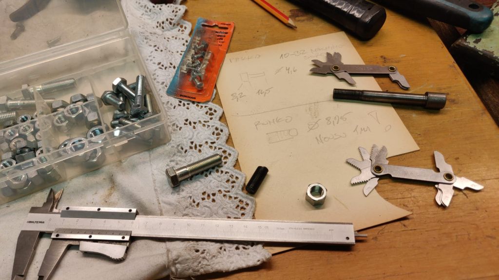Tuli heti tuntumaa koneen outoihin kierteisiin. Ruuvi oli 8,95mm 1mm nousulla. En ryhtynyt tekemään samanlaista. Myöhemmin tämä ratkesi vetämällä M10 kierteet johteisiin.