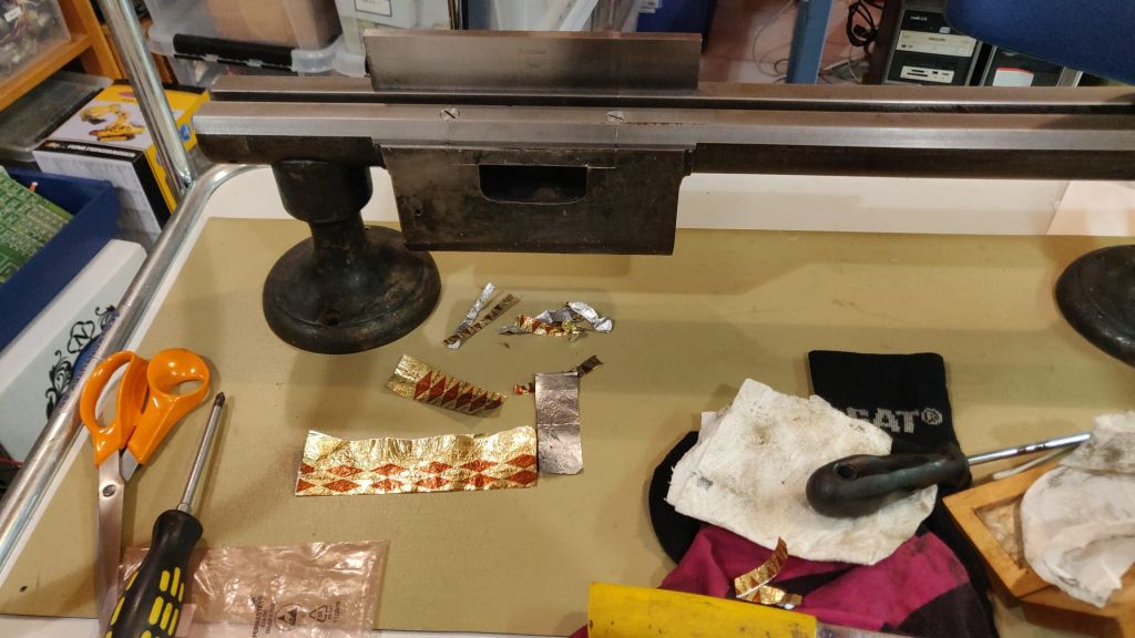 Tässä pieni moka oli, että koneistuksessa jäi tuo kitapala vaille huomiota. Kun sen myöhemmin irroitti niin paljastui maalia ja muuta moskaa alta. Kun ne putsasi oli kitapala shimmattava johteiden kanssa samaan tasoon.