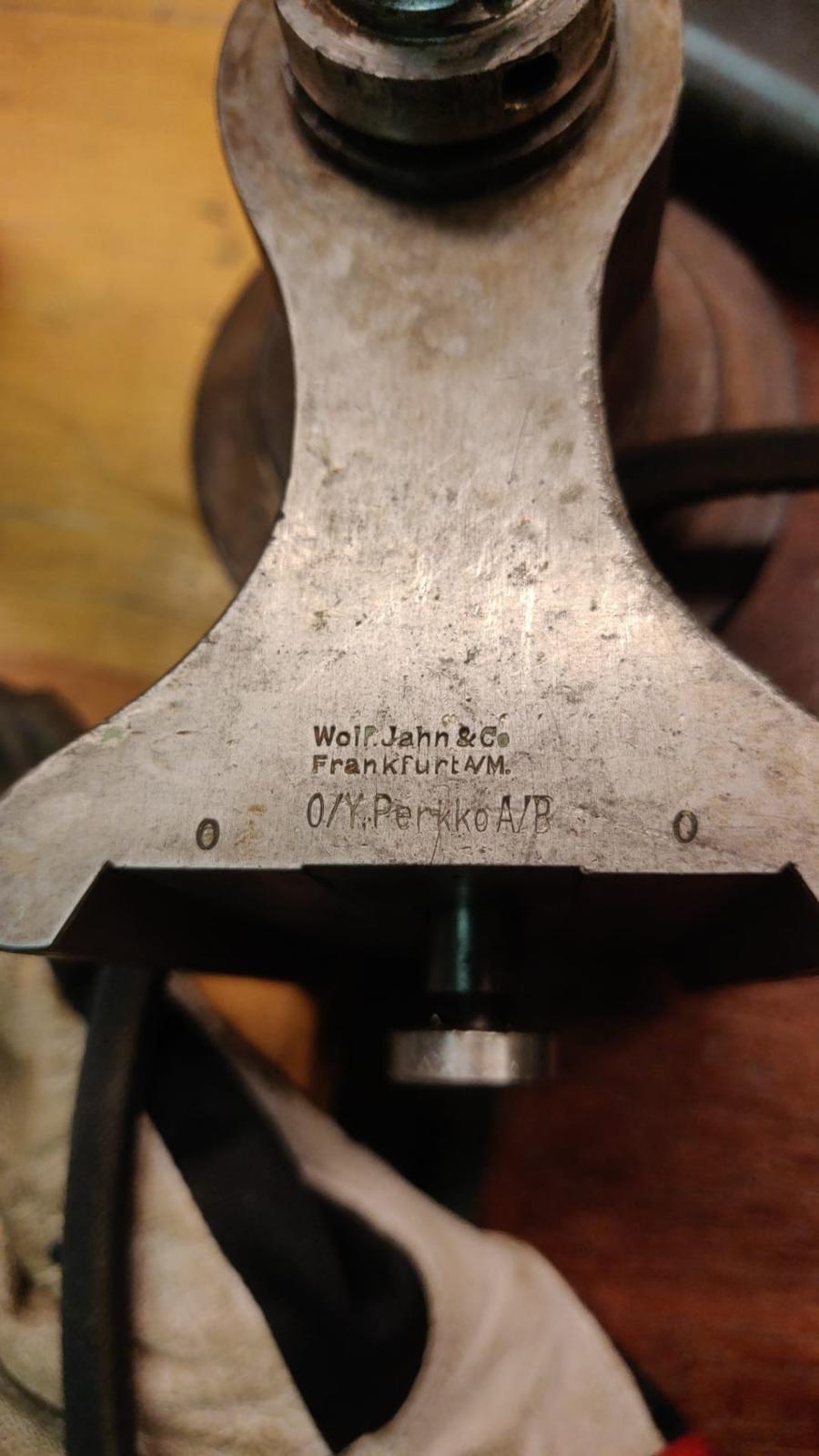 Purun ja osien esipesun aikana kiinnostus heräsi, että mikä sorvi tämä oikeasti on. Pesu ja repsuttelu paljasti karapylkästä tekstin: Wolf.Jahn&Co Frankfurt A/M. Oy Perkko vielä meistänyt oman maahantuojan tunnisteen siihen. Lisätutkimuksissa selvisi, että tämä lienee malli C70. Joltain nettisaitilta löytyi 1903 työkaluluettelo missä tämä kone jo esiintyi. Tämä yksilö ei liene niin vanha, mutta vanha kuitenkin.