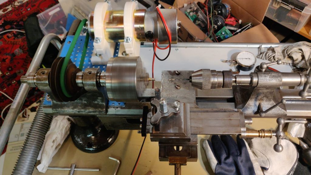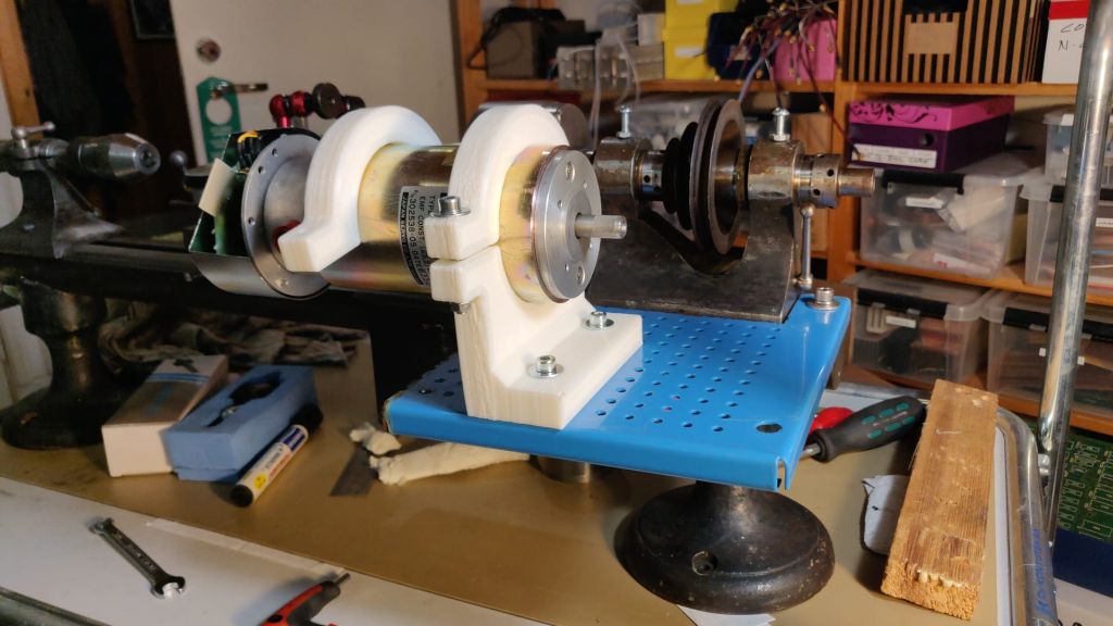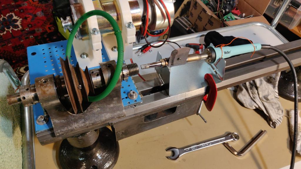 Moottoriratkaisua funtsaillessa ei tuntunut houkuttelevalta ruveta sovittelemaan koneen mukana tullutta VEM mosaa tähän. Muisti on kummallinen. Muistin, että luokkaa 40v sitten tullut otettua talteen Diablo 630 kiekkokirjoittimen kelkan moottori. Tuollainen pienen starttimoottorin kokoinen DC servo. Tarkkaa speksiä ei löytynyt, mutta alkuperäisessä käytössä jännite ollut 40V. 3D tulostimella pukit ja väliaikaisesti pellinpalaan kiinni niin pääsee koeajamaan. Kiinan siivapyörät tai aihiot oli vielä matkalla. Hermo petti niin piti tehdä ensimmäinen pitkästä. Alunperin veto ollut todennäköisesti pyöreällä nahkaremmillä. Pyöreetä PU remmiä saa metritavarana. Tässä suuri etu on, että karapylkkää ei tarvitse purkaa vaan remmin voi hitsata in situ. Hitsauslaite syntyi kun ison kolvin vastuksen ympärille taittoi kuparilevyn. Ensimmäinen sovitus meni perseelleen. Opin heti, että hihna pitää tehdä noin 10% nimellismittaa lyhyemmäksi niin on sopiva.