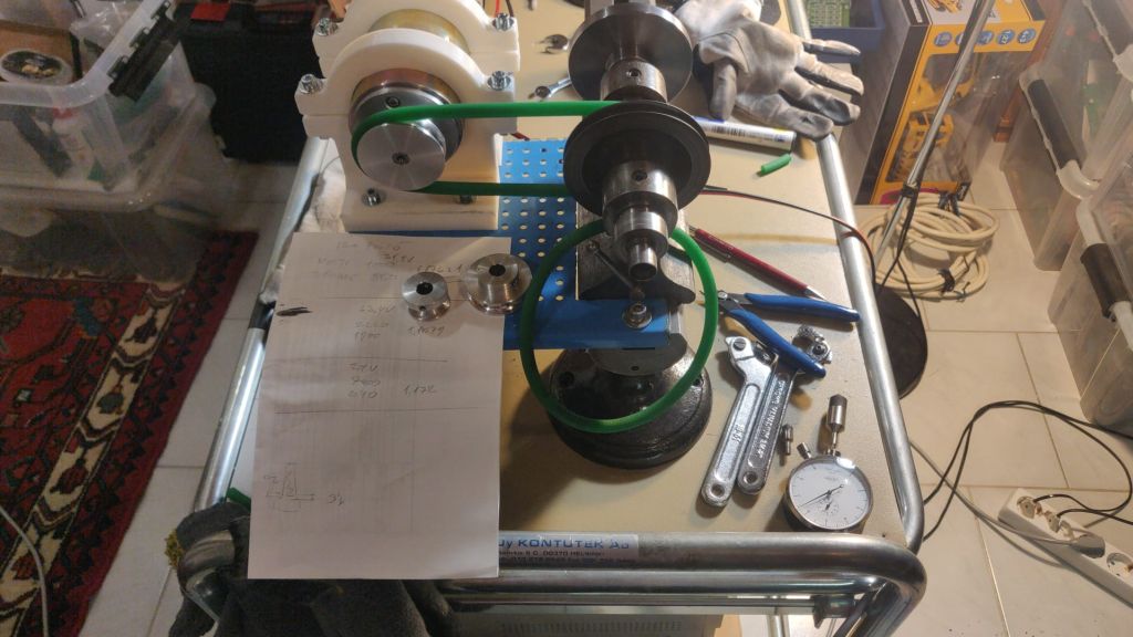 EXCELLOn nykyinen, ainakin 40 vuotta paikallaan ollut, alkuperäiseen nähden nelinkertainen moottori, heiluu poratessa. Miksi näin? Moottorin kiinnitys on hieman erikoinen. Porakoneen valurauta rungossa on reikä, johon sähkömoottorin 35 mm akselitappi kiinnittyy. Aikaisemmista kuvista näette, kuinka se kuuluisi olla (harmaa porakone), ja kuinka se aikaisemmin meillä oli, (vihreä porakone). Juurisyyksi (2020-luvun teollisuuden muotisana, jota töissä viljellään viljasti, ja joka allekirjoittanutta vituttaa niin että veri ei kierrä) paljastui moottorin 5 mm taustalevy, sekä sen kiinnitys kahdella pultilla ilmeisesti alkuperäisestä sähkömoottorista leikattuun palaseen. Vaikea selittää, vertailkaa kuvia ne joita asia jaksaa vielä kiinnostaa. Koitin kiristää heiluvaa liitosta, ja naps, toinen M10 pulteista poikki. Vittu, nyt pitää tehdä kaikki uusiksi... Seurasi siis tunti tolkulla rälläköintiä, hitsaamista, sorvaamista, poraamista, viilaamista, jne. Tässä lopputulos joka on tukeva. Alkuperäiseen akselin (70 mm pitkä) on nyt hitsattu 16 mm paksu pyöreä laippa. Siihen on tehty 4 kpl M10 kierrereikää, johon pultataan uusi 8 mm paksu moottori teline. Nyt kokoonpano näyttää tältä. Ennen moottori oli vinossa pora-akseliin nähden, ja remmilinja oli korkeus suunnassa 15 mm pielessä. Nyt se on jumalauta justiinsa! Moottorin hihnapyörä on A-remmille tarkoitettu, ja B-remmi kulki aivan sen ulkoreunaa, ja vielä reilusti se yli. Lisäksi siinä oli aika lailla kulumaa nimellismitan kohdalta. Hieman sai sommitella sorvin kelkkaa ja teriä että sai sorvattua hihnapyörän molemmin puolin 20 asteeseen (remmi 40 astetta). Onko teillä hetki aikaa puhua kiilahihnoista? Tässä porakoneessa oli tehtaan jäljiltä lattahihna, läskiremmi, mutta nykyään V-hihna B64. B tarkoittaa leveyttä 17 mm, ja 64 pituutta tuumina, joka tekee millenä 1625 mm. Helppoa eikö niin? Periaatteesa kyllä, käytännössä ei.. Näissä 40 asteen hihnoissa, joissa on tuuma mitoitus, nimellismitta on sisämitta. Tämä esimerkki hihna on ulkoa 1694 mm. Rullamitalla sain tuloksen 1700 mm. Viimeisen 50 vuoden aikana moni auton tuulettajan hihna, esim SPA 13x1700, on mitoitettu ulkomitan mukaan. Tuolta saa hyvää tietoa remmeistä, siltä katsoin itsekin mitä olikaan B-hihnan kulma: https://halikonkumipalvelu.fi/sites/...hihna-INFO.pdf Aiemmin laskeskelin poraus karan nopeutta, ja sain tulokseksi 286 rpm. Sitten muistin, että onhan mulla mittarikin siihen ja oikein Biltema merkkinen! Ostin tämän pelin ehkä 15 vuotta sitten. Aikanaan mittasin muistaaksi yhden polttomoottorin kierroksia. Sitten värkki jäi seisomaan ja patterit oksentivat koneen sisälle. Ei muutakuin patterikotelon siivousta, ja kolmen euron sijoitus uusiin virtalähteisiin. Tuloksena karan nopeus 290 rpm, ja moottorin 1490 rpm. Molemmat tulokset ilman kuormaa. Aiemmin valehtelin 286 rpm, ei mennyt kauasksi. Moottorin hihnapyörän sorvauksen jälkeen karan nopeus on 273 rpm. Eli välitys muuttui 5.14 --> 5.46. Remmi on aika kulunut, ajattelin tilata uuden. Uusi remmi lisää välitystä. Jossette usko, kysykää vaikka mopoauto pojilta! Tämä ei ollut oikeastaan porakoneen entisöintiä. Muutoksia muutettiin paremmaksi. Jos tätä entisöidään, niin nyt tehdyt muutokset siistitään ja maalataan aikakauteen sopivaksi. (Edellä mainittuihin muutoksiin ei ole ostettu mitään osia tai tarvikkeita, kaikki on löytynyt omalta verstaalta. Lisäksi kului kaksi laiskaa työpäivää, seä kuusi keskiolutta. Nyt ajattelin jouda päälle pienen jaloviinan)