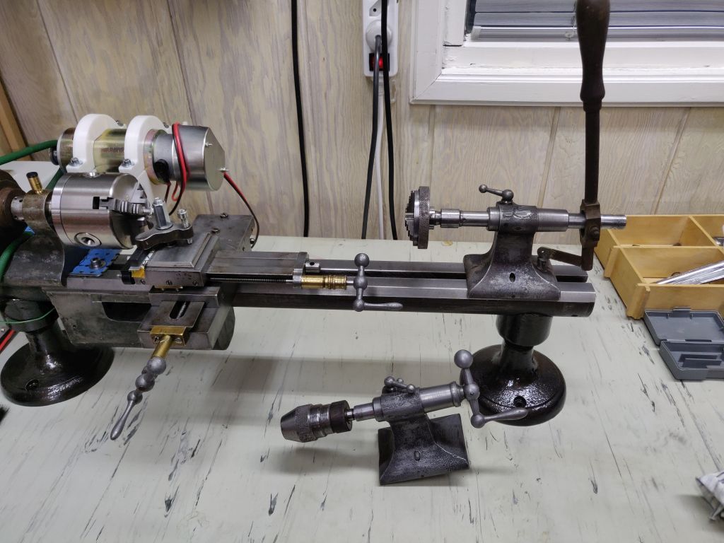 Kierteiden osalta tälä Wolf on outo tapaus. Vaikka saksalainen kone puolet kierteistä tuumaisia ja lisäksi epästandardeilla nousuilla. Ensimmäisessä kuvassa näkyvä putkihäkki missä moottori ollut kiinni kasattu ja kiinitetty UNC ruuveilla. Kitapalan ruuvit tunnistettu UNS 1/4-24 kierteeksi. Minipakasta löytyi ruuvit 3.2mm x 0.6 kierteellä. Pakka mikä muuten on englantilainen Burnerd on kiinni karaputkessa noin 20mm 11tpi Witworth kierteellä.