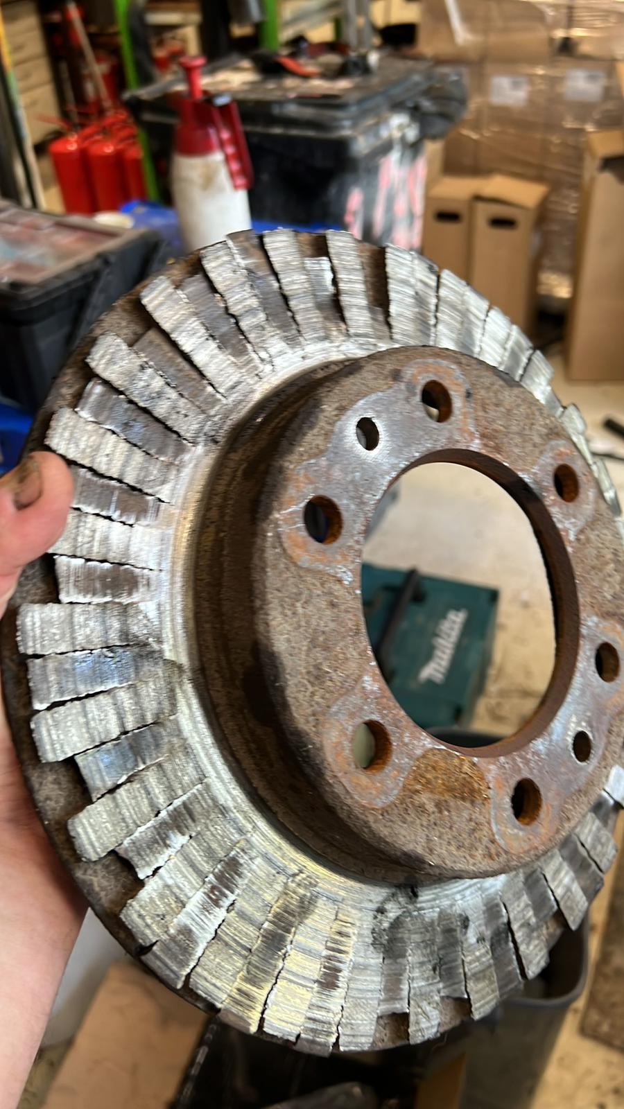 Autohan oli katsastamaton. Leimalle piti viskata uudet etujarrulevyt ja palat kun edellinen seppä oli laittanut jarrupalat väärinpäin eli rauta rautaa vasten