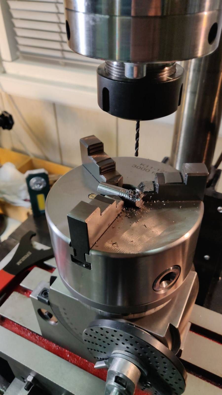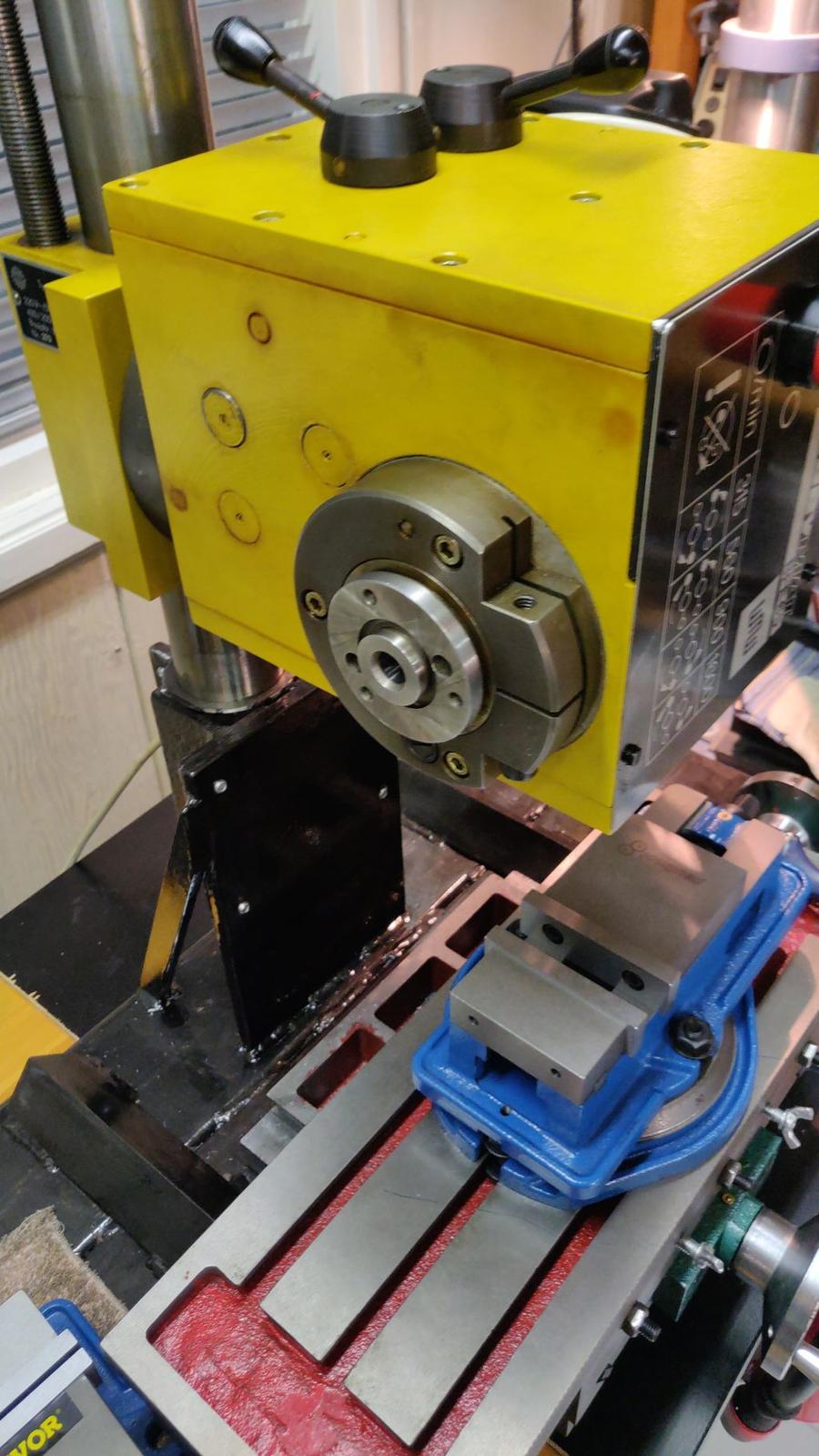 Koneen alkuperäinen Z-akselin syöttö on tolpassa oleva ruuvi minkä varassa koko kone lepää. Epäkäytännöllinen ja jäykkä käyttää. Lukitusten aukominen ja lukitseminen ei paranna tarkkuutta sekä joskus tekee omiaaan. Putoaa useamman satasen naksahtamalla. Koneessa oli myös ns. porasyöttö eli kampi kyljessä millä voi liikutella karaa alas-ylös. Hurjan sattuman kautta eteen tuli 62x49x27mm matoruuvivaihteen keskeisimmät osat eli runko ja hammaspyörät. Välityksestä ei ollut tietoa, mutta laskennan perusteella on 50:1 eli hyvin sopiva tähän käyttöön. Ei muuta kuin sovittelemaan ratasta kammen akselille ja siitähän se lähti. Ensin osa millä rattaan sai kammen akselilla olevaan tappin kiinni. Sitten matoruuvin laakerit ja niiden sovitusholkit.