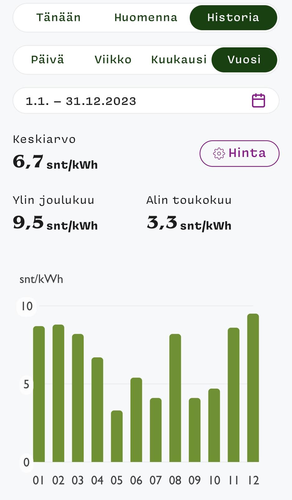 Helmikuu 8,00 Maaliskuu 7,86 Huhtikuu 6,21 Toukokuu 2,65 kesäkuu 5,41 Heinäkuu 3,71 Elokuu 7,35 Syyskuu 3,41 Lokakuu 3,50 Marraskuu -3,77 Joukuun hintoja ei ole vielä tullut mutta eiköhän liene selvää että millään muulla sopimuksella ei noihin hintoihin pääse. Vaikka kyllä ne kahden euron kilovattihinnat vitutti. |