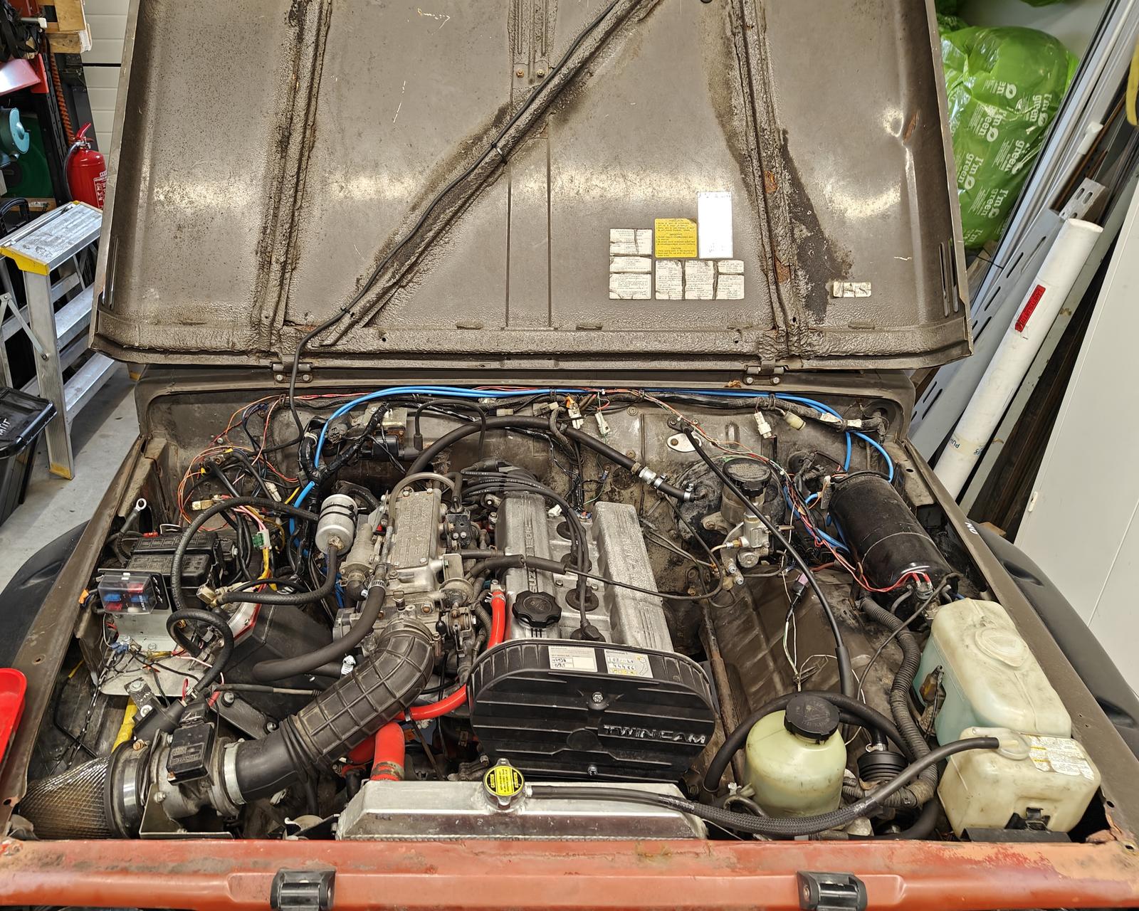 Homma alkoi sillä, että tempaisin kone- ja laatikkopaketin vex. Johtosarjan kääriminen oli jäänyt syystä X viimeistelemättä. Kieputtelin teipit näkyvien irtojohtojen ympäri ja lisäsin muutaman nippusideankkurin, joilla johtosarjan liikkumattomuutta voi varmistaa. Pitkään ollut ilman hytistä toimivaa lämmönsäätöä, kun lämppärin hanalle tuleva kaapeli on saanut vuosien varrella kipiää, eikä liikkunut takeltelematta. Olin sitten ottanut koko kaapelin pois. kaivoin jossain vaiheessa purkuautosta talteen ottamani varaosan ja asentelin takeltelemattoman lämmönsäätökaapelin. Luksusta Samalla säädin hytin puolella ilmaluukkujen asentoja, että ikkunalle puhaltaisi oikeasti. Eli jalkoihin tulevan ilman luukun säädin olevan niin kiinni kuin se suostuu olemaan. Se tuli aika nopeasti todettua, että syylari tuli aikanaan laitettua naftisti liian alas, joten sen kiinnitysten revisiointi oli vuorossa myös. Nooh, ohjausvarren nivel oli väljä ja se oli mulla vaihtolistalla. Sain varren irti ja totesin, että väärällä kartiolla oleva nivel laitettu ![]() Tässä autossa kirjaimellisesti kaikki mihin en ole koskenut itse on jollain tavalla rikki, tai perseellään... Autoon oli jonkun edellisen toimesta laitettu Opelin simpukka Juukan miesten adapterilla. En aikaisemmin olekaan tätä lähemmin käpistellyt, mutta ei tuu ten points tästä laipasta. Simpukka on sen verran killissä, että Suzukin ohjausvarressa oleva rättinivel tekee aika jyrkkää liikettä, omaan silmään liiankin jyrkkää. Vielä hurjempi on täytynyt olla tuo kulmavirhe silloin, kun tässä oli kopan ja rungon välissä ne tosi paksut värinänvaimennuskumit korinkorotussarjana, hengenvaarallisia virityksiä ![]() Ei muuta kuin oma laippa tilalle, jolloin simpukan asento korjautuu niin, että ohjausakseli on jotenkuten linjassa simpukan kanssa ![]() Öljycooleri on ollut listalla, sille intouduin tekemään kiinnikkeet. Dimplet tein Bilteman dimpletyökalulla, jotka ostin pari vuotta sitten kun oli vielä valikoimassa. Tiggeröintiä pitää vielä harjoitella Tässä nyt oli melkein kaikki persiillään, liikaa virtaa, liikaa lisäainetta, paikoin epäpuhtauksia huonosta puhdistuksesta johtuen (sinkkipeltiä), työasento jne...Tuli kyllä topakka kiinnitys, ei heilu ![]() Mahtuu maski hyvin vielä paikalleen. Kilvelle pitää kehittää uusi paikka, kun se oli aiemmin just tuossa öljycoolerin korkeudella maskissa. Kiinnikkeisiin jossain vaiheessa maalia pintaan vielä tietty.