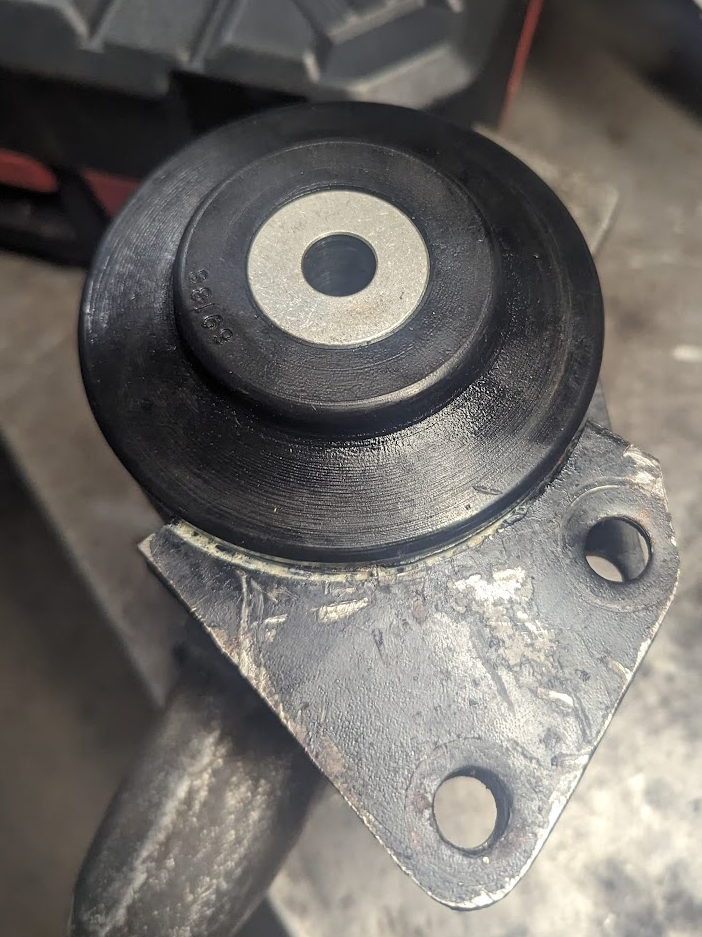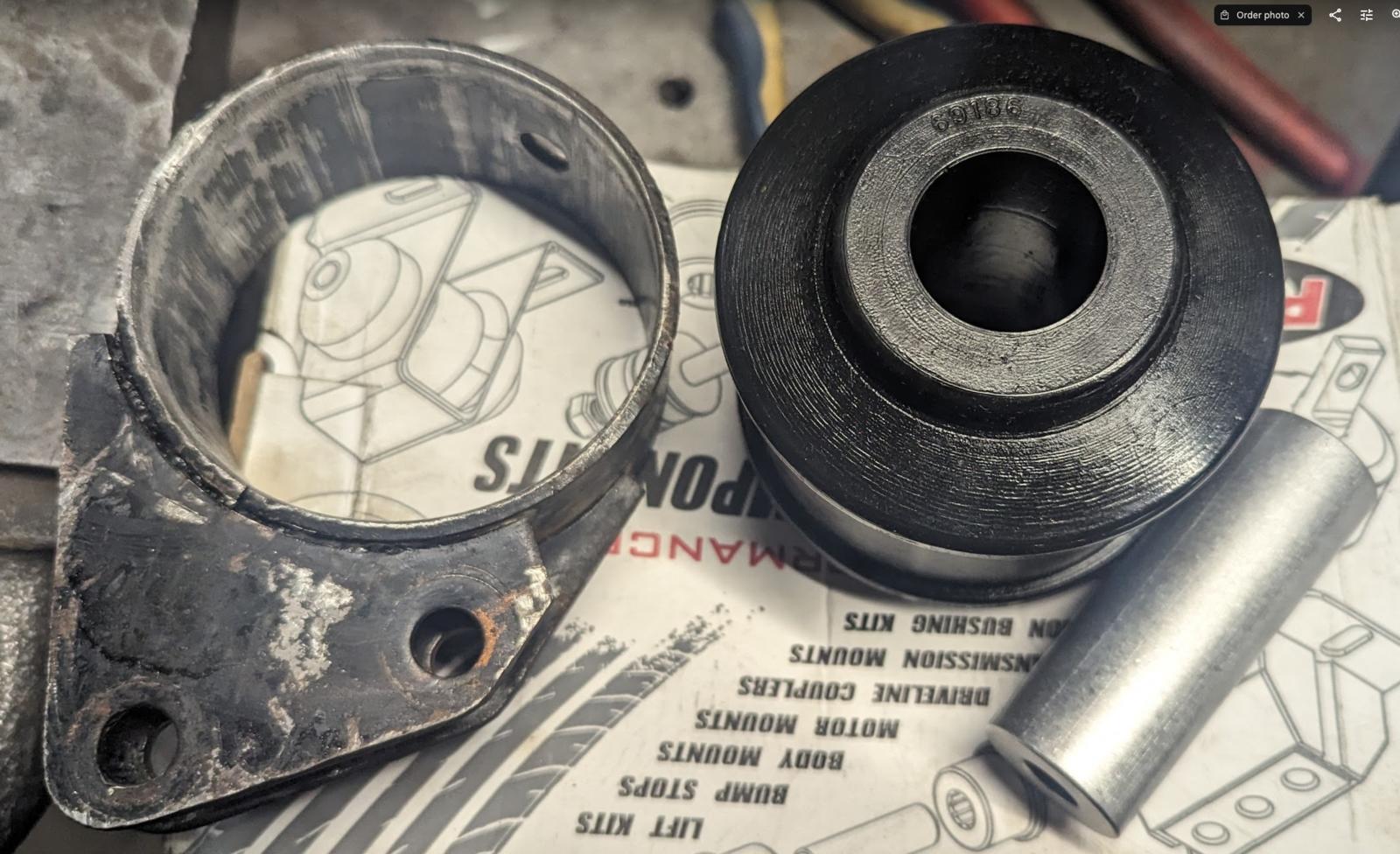 Tyhjään pesään sopii Prothane 1-504-BL uretaanipuslat, vaan niistä pitää ottaa keskellä oleva metallitappi pois että mahtuu. Pari kolme kertaa piti yrittää prässin kanssa ennen kuin oikea tyyli löytyi. Litiumrasvaa väliin ja painetta tasaisesti puslan laidoille. Puslalle tilaa mennä renkaasta läpi Valmis tuote paikalleen punnerrettavaksi. Olisi kannattanut tehdä viisteet keskitappiin että pultti menisi helpommin paikalleen ![]() Jostain syystä näiden paikalleen saaminen on aina taistelu. Apukuskin puoli ensin paikalleen, sitten kuskin puoli vääntöraudan kanssa. En huomannut ylimääräisiä tärinöitä, mutta kone tuntuu nyt pysyvän paremmin paikallaan kiihdyttäessä.