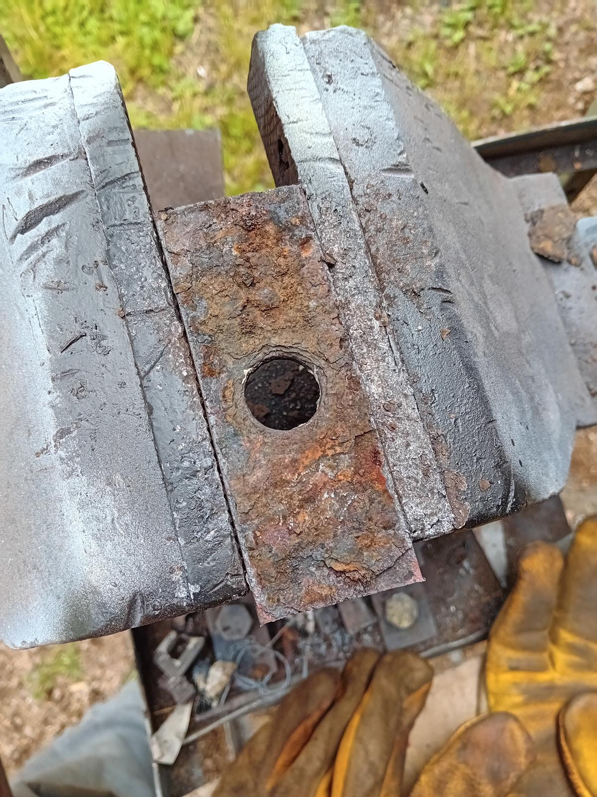 Nyt otin jousen pedit auki. Aika pahalta näytti, etenkin toinen. Neulahakkuri on kuitenkin ihan helvetin hyvä keksintö ja sain ruosteet pois. Laitoin ruosteenmuuntoaineet ja hitsasin kiinni. Mittasin tönärillä että irti leikattu pala tulee oikein paikalleen. Silti vähän jännittää että tuleeko tuosta hyvä... Kuinka tarkasti pitää olla keskellä tuo reikä? Tönärin mukaan olivat keskellä.