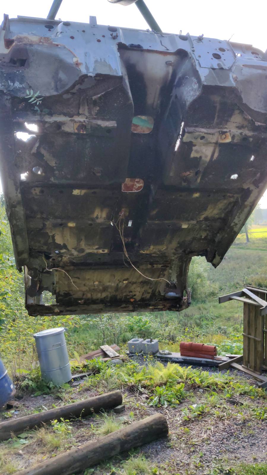 Tästä se lähtee. Paikoitellen löytyi tervettäkin peltiä. Hyppyytti muuten aika monta kertaa Jameksen hyttiin ja takaisin. Muutenkin mielenkiintoinen kokemus laskea hytti yksin paikoilleen. Oivallus oli laittaa muoviputken pätkä jakolaatikon kepin päähän ja ohjasnarut koriin millä pystyi Jameksen hytistä kääntelemään koria.