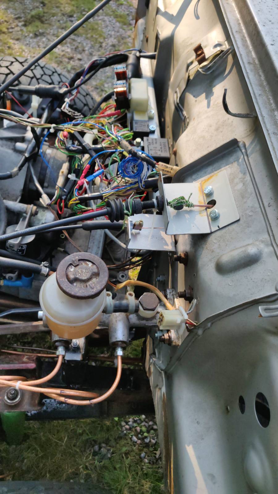 Näpertelyosastolla oli vielä tekemistä. Kaasu- ja kytkinvaijerit piti liittää polkimiin. Kaasu onnistui helposti, mutta kytkimessä on kuitenkin sen verran voimaa, että 1mm hitsauslangasta tehty lenkki luisti vaijerin nippelin ympärillä. Pitää myöhemmin tehdä parempi osa tuohon.
