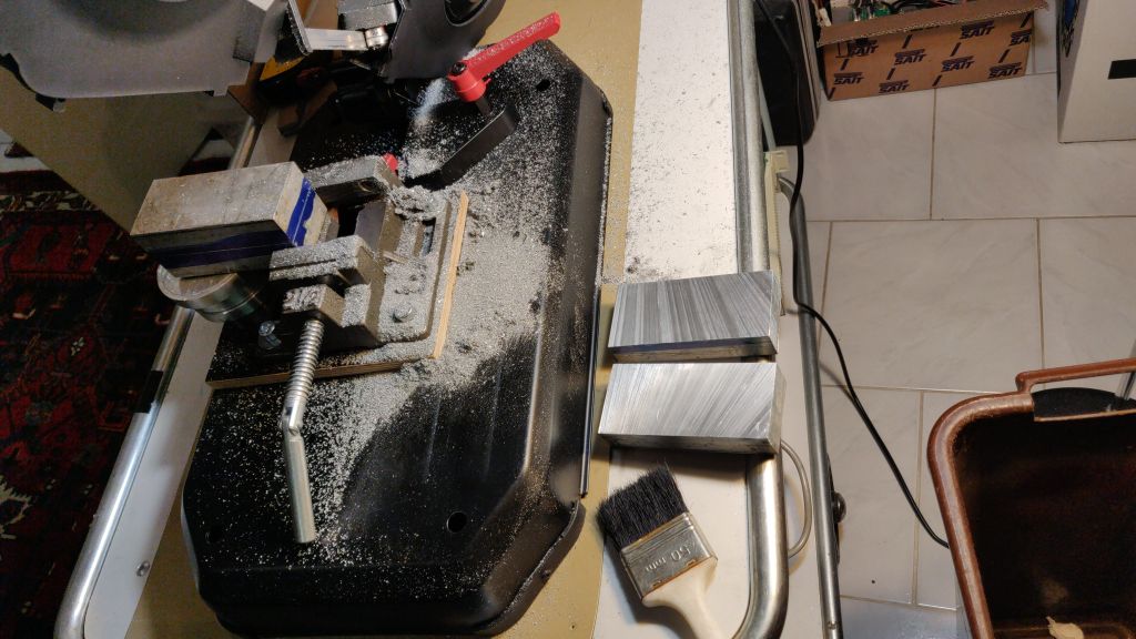Laakeripukki- ja vetomutteriaihioita valmistamaan. Tässä hyvä tulikoe Liiterin sahalle. Materiaalia kun ei löytynyt muuta lähellekkään sopivaa kuin 50x50 alumiinitankoa. Pulikoiden halkaisu onnistui yli odotusten. Suora sahaus ja hyvä jälki. Tämä kikka on varmasti tiedossakin: Alumiinin sahaus ja koneistus sujuu helpommin kun käyttää leikkuunesteenä tenua.