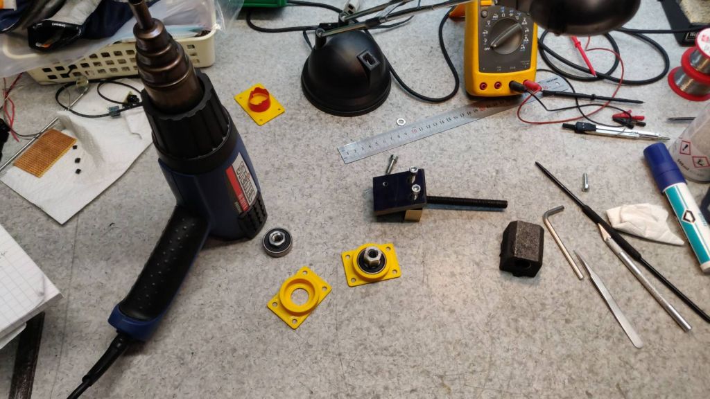 Laakeripukkien rakenne sai heti ns uuden twistin. Reikien jauhaminen pienellä koneella alumiinimurikoihin näytti työläältä. Muuttunut rakenne lähti Y-suunnan konstruktiosta liikkeelle. Y-kelkassa kun on luonnostaan suunnilleen sileät päädyt ja etupuolen akselinreikäkin valmiina, Tollasessa paikassa laakerihan ei tavitse juuri mitään sivuttaistukea. Mieni mitoitusfuntsailu ja 3D-osia tekemään. Niitä tehdessä tuli mieleen, että saman rakenteenhan voi soveltaa myös X-suuntaan. Laput vaan kelkan päihin ja samanlaiset laakerihollarit päälle. Lattaa poikki Liiterin sahalla ja reikiä tekemään. Vähän haastetta oli kelkan vasemman päädyn ruuvinreikien poraamisessa vapaalla kädellä kun kelkka ei mahdu porakoneen alle. Porakoneesta puheenollen. Uudet keernaporat toimivat hyvin, mutta vanhasta Power-merkkisestä kiinankoneesta loppui voima ja meinas hajota koko paska.