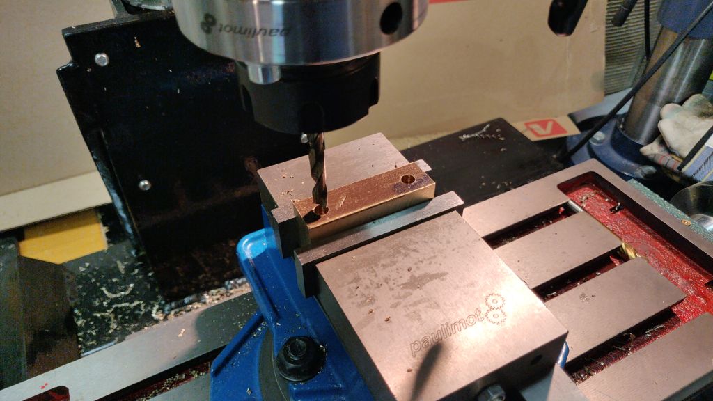 Vetomutteri syntyi messinkiklunssista. Siinä pääsi kokeilemaan uusia työkaluja. Ruuvin senkkausjyrsimiä ja pyöristysryrsimiä. Hieno osa tuli, mutta mitoitus meni millillä pieleen kun ei huomannut, että X-pöytä on kupera alapinnaltaan. Vetomutterissa ei ainakaan toistaiseksi ole välyksen säätöä. Aika näyttää tarvitaanko tällaista ominaisuutta. |