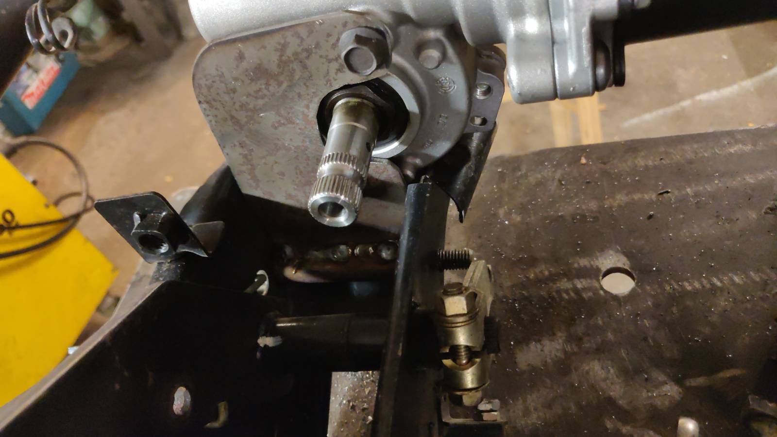 Jtekkejä kun oli kaksin kappalein niin arpa osui siihen. Eikun purkamaan. No Japanilainen oli tehnyt jekun. Säätövivin lukituspultti aukesi oudon tahmeasti ja julmalla voimalla. No siinähän olisi ollut vasen kierre. Sitten vaan funtsailua ja mitoitusta. Alkoi näyttämään siltä, että kyllä se tohon mahtuu ja jalatkin menee vielä polkimille. Samoin näytti siltä, että akseleita sopivasti pätkimällä ja modifioimalla voimansiirtokin saadaan kasaan.
