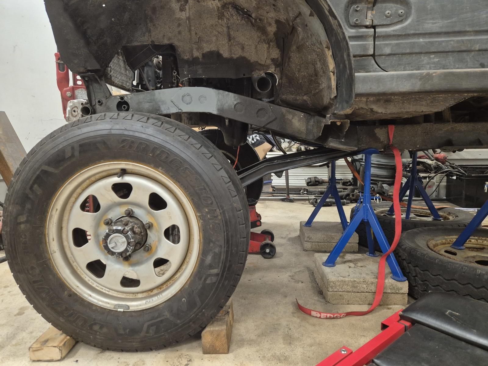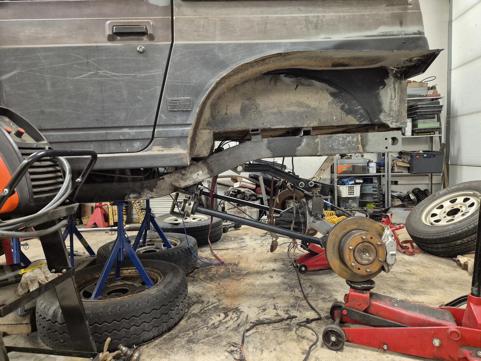 Turhaa rompetta purettu roppakaupalla. Alusta enää lateilla ja jarruletkuilla nippa nappa auton alla. Alkaa olemaan akselien siirtoa ja tukivarsien mallailua seuraavaksi. Eli takapään lokareiden jatkot hiukan yli puoli välin. Samalla takaluukun sopivuuden tarkastelua. |