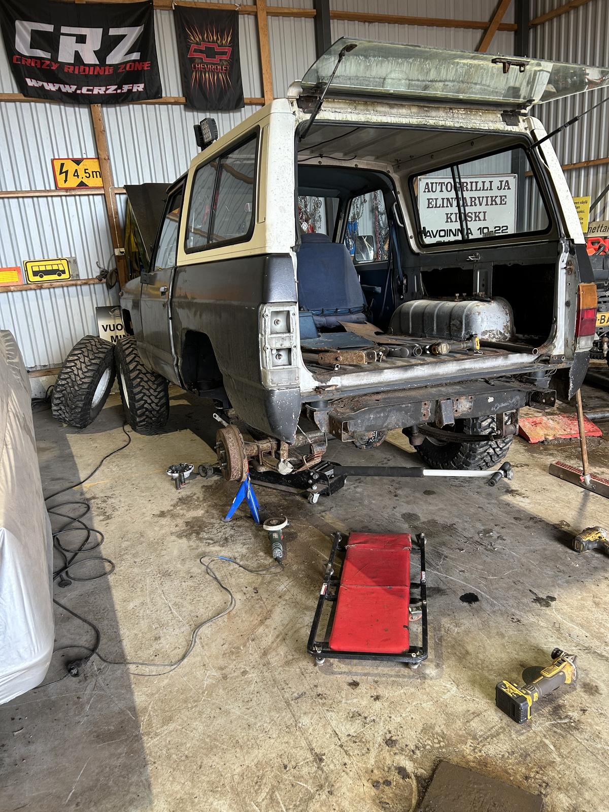 Musta pelaa ja liikkuu niin saa väistyä näpräilyltä vähäksi aikaa. Portaalia sais ruveta laitteleen edellisten ajojen jäljiltä… takaovi korjata kun nyt liinalla kiinni. Vaihtaa uutta peltiä eli lokasuojat, ovet ja takanurkat oikoa tai tehdä kokonaan uudestaan. Helmaan/takapyörän koteloon tuli nyrkin kokoinen reikä Asis suunistuksessa.