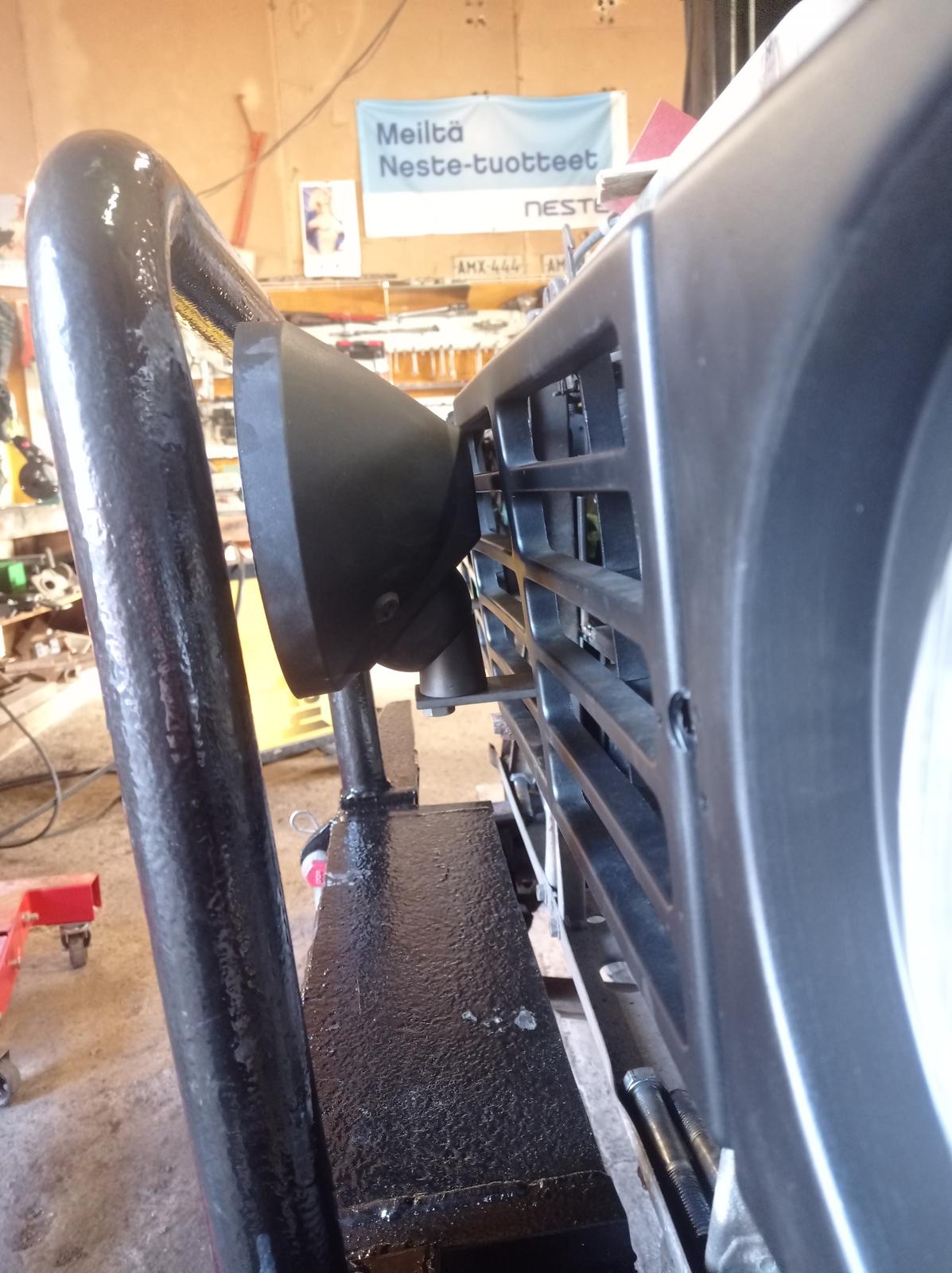 Puskuri on jo aika hyvällä mallilla. Lisävalot ajattelin kiinnittää tuollein, että tulee siististi pelkät 5mm lattaraudan pätkät maskista läpi...