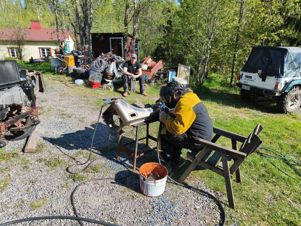 Nyt on sen verran ttuoretta peltiä lattiassa, että tossut ei huku mettään. ![]() Sadekkaan ei hidastanut tekemistä. Pressuteltta päälle ja homma jatkui täydellä vauhdilla. ![]() Lokasuojien aihioiksi löytyi Maken Samuraista aikoinaan hyljätyt ruosteenpesät. Noh kun ei muuta ole niin nämä ovat hyvät. Pahvi CAD käyntiin ja kohta mulla olikin sitten lokasuojat. ![]() |