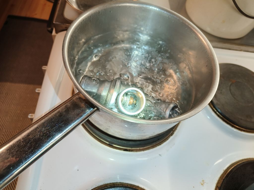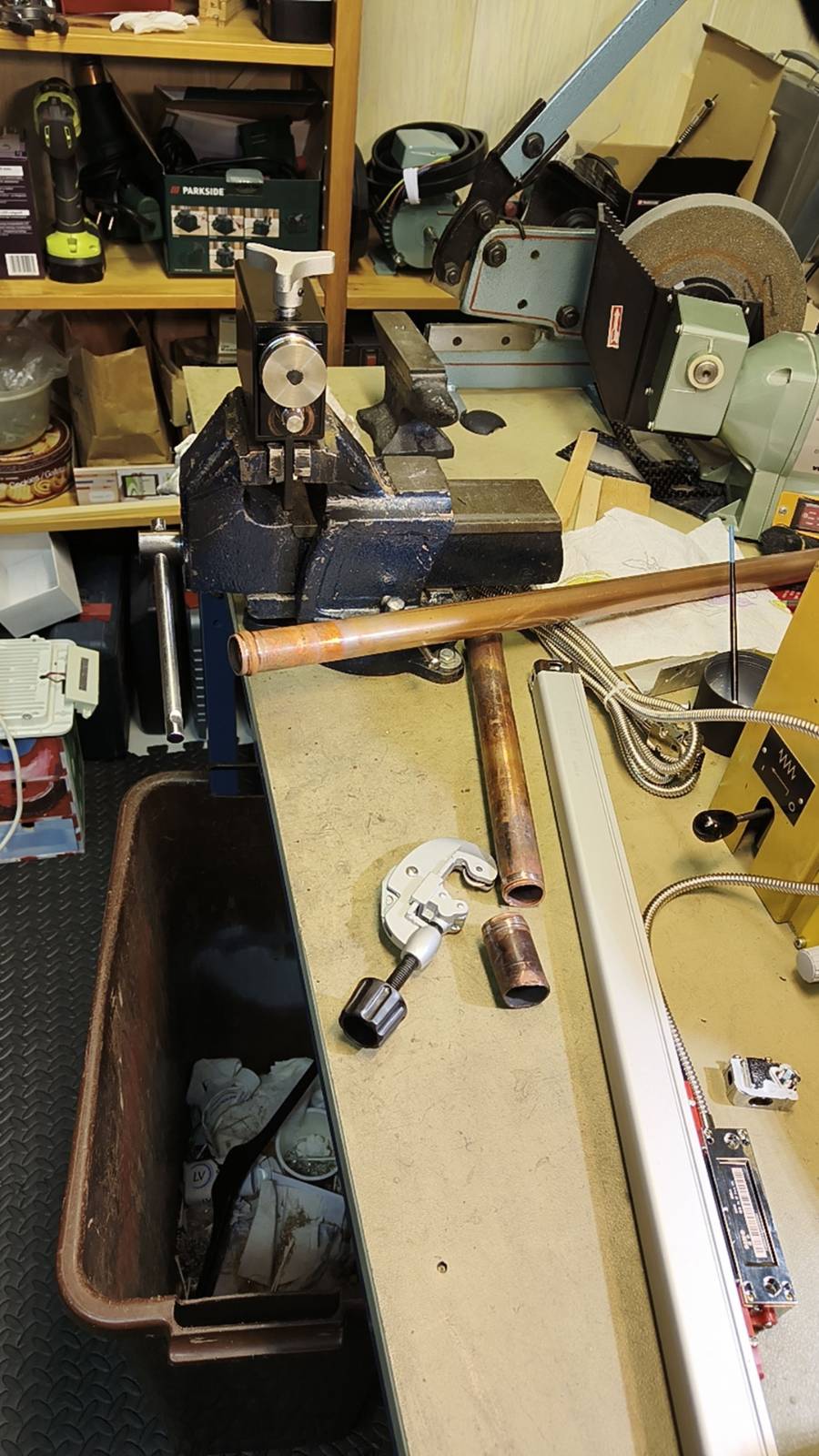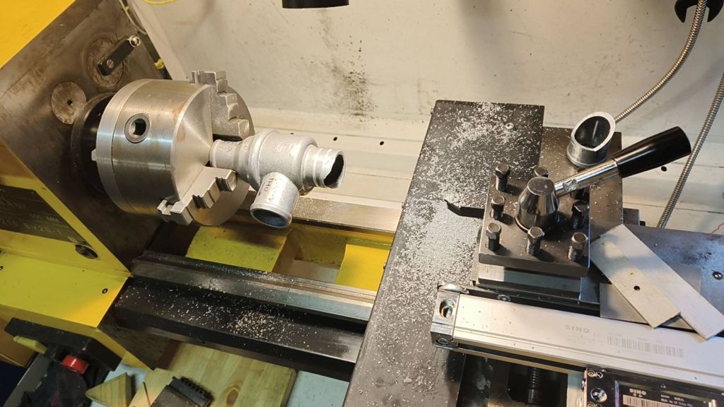Optio 1.0 oli tehdä kääntö väärään suuntaan lähtevälle ohivirtausportille vesijohtomuhveista. Ajatus ei kantanut kovin pitkälle. Termari sorviin ja turhat vekit suoraksi. Pätkä letkua kunnon klemmareilla ja 90 vinkkeli perään niin alettiin olemaan oikeassa linjassa. Osa asennusvalmis. |