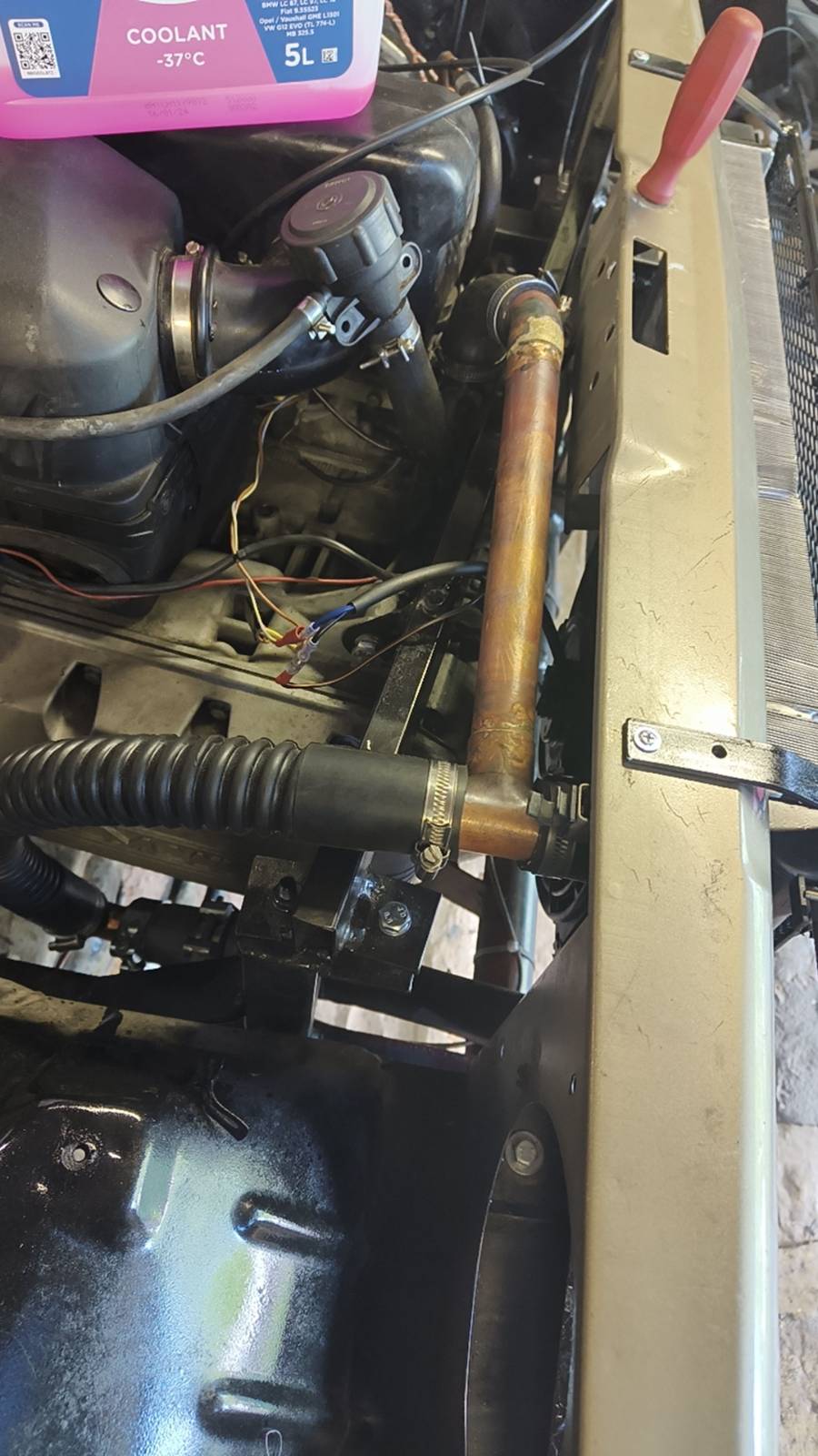 Täyttökorkki ja paisuntasäiliön liitos tuli jätettyä alkuperäiseen ohivirtausputken liitäntään. Hetken mietin tekeekö ilmataskun putkeen. Ei tee kun myäs ohivirtaus kylmänä menee samaa putkea pitkin ja aika julma pumppu lykkäämässä. Paketti paikoillaan. Koeajot alkakoon. |