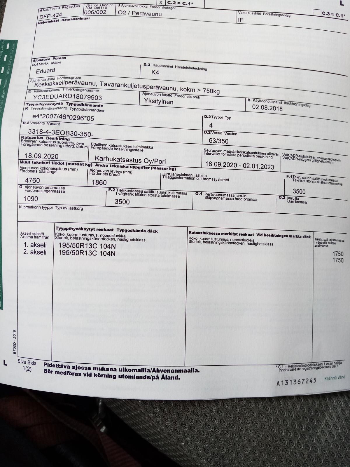 Kantavuus ilman lavaa 2410 kg. Katsuri meinas että on ainoa rekisterissä oleva henkilöauton koukkulaiteperävaunu