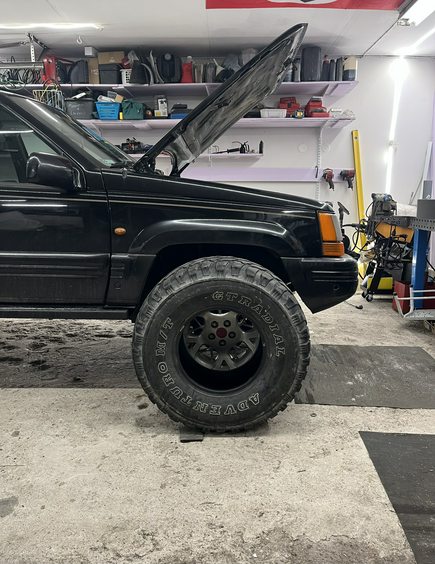 Mulla oli 5.9- koneisessa 32" renkailla 4.56 välitykset ja ne oli just passelit, jaksoi kulkea kuten kuuluu. Voin vain kuvitella miten surkea kuutoskoneinen ZJ on 33" renkailla orkkisvälityksillä. XJ:ssä minulla oli 4.88 välitykset ja 35" kumit, oli ihan sopiva. Rakennettuna se auto painoi vaa'alla ~1800kg. Mitä tuohon rengas- vanneyhdistelmään tulee, niin laittaisin ehdottomasti 8" leveille vanteille, helpottaa moneltakin osin asioita. Edessä pyöränkoteloita saa avartaa aika reilusti myös etuosasta (akkukotelon ja ilmanputsarinkotelon alta) että mahtuu renkaat pyörimään järjellisesti matalahkolla korotuksella. Vaatii siinä kohtaa myös akun siirtämisen tai sitten rakentaa uuden telineen sille, samoin ilmanputsarin kotelon pohjaa täytyy muokata. Tämä on aivan luokattoman huono kuva, mutta saanee ajatusta minkä verran täytyy poistaa tavaraa.. ![]() Tässä vähän parempi laadultaan, 33" renkaan edessä on 35" ilman vannetta: