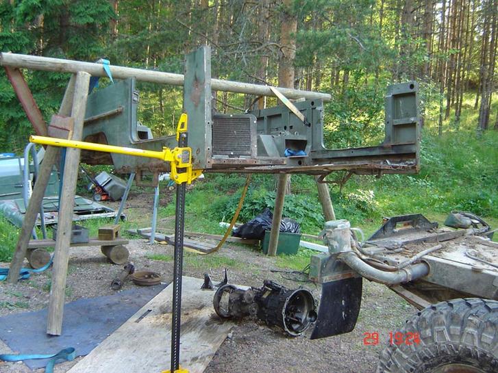 Nyt se on tommosessa tilanteessa, tästä on sitten tehtävä päätös jatkon suhteen. Amme on aika kuppanen, joten sen korjaaminen tarttis villusti hitsaamista ja toisaalta taas jonkinmoisen avolava-puolikopin tekeminenkin mietityttää kun olis kiva jos olis yhteensä kolmelle pärsuunalle istumapaikat katon alla ja "lämpöisessä"??