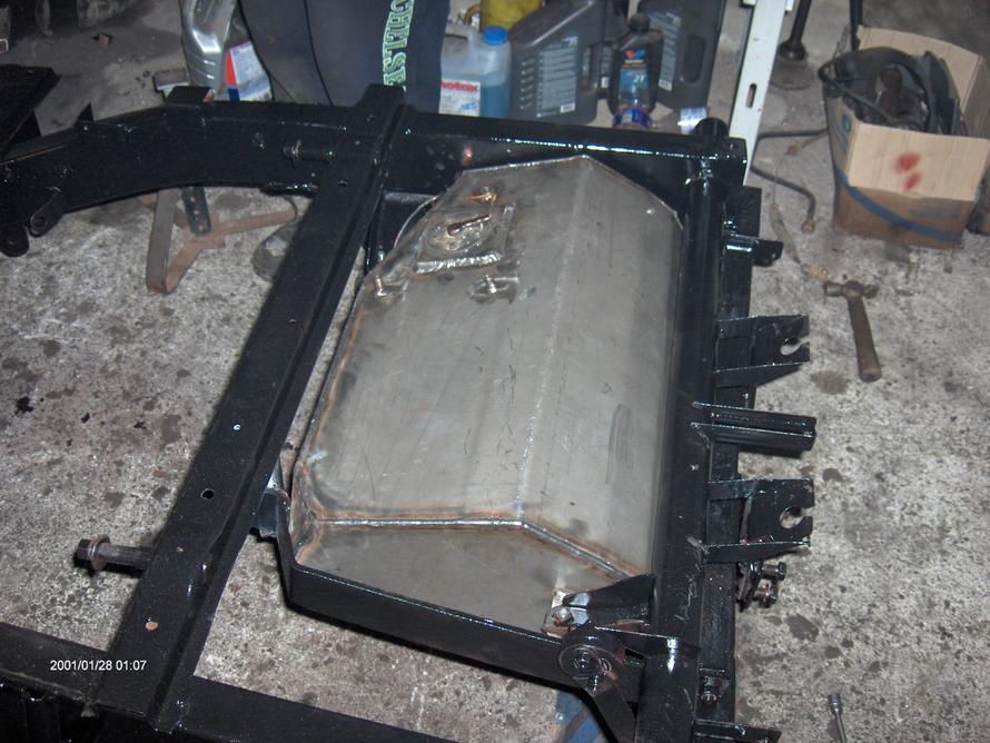 Vakio tankki oli ruosteessa ja vuoti, joten justeerasin ruostumattomasta uuden tilalle. Akselin tassut siirretty toiselle puolelle, panssaroitu ja suditty pohjamaalia pintaan. Volvon laatikkoon piti tehä hieman muutoksia kepin paikan suhteen. Tämmösen väänsin ja hyvin tuntuu loksahtelevan. Siina korin pohja saanut pintavärin. Saa ruveta pikkuhiljaa tekemään pohjatöitä korille... Kannattaisiko akseleiden ja laatikoiden huohottimet tuoda letkulla mahdollisimman ylös vai ottaako vettä sisään jos käy vähä kylpemäs? |