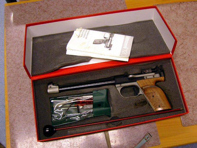 -pienoispistooli Hämmerli Switzerland kal .22 laatikossa, oikeakätiselle, ammuttu huvikseen kuulemma 70-luvulla 100 laukausta