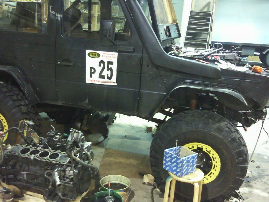 Muutama kuva päivän tilanteesta. Uusi moottori paikallaan ja vanha irrotettu. Yhdessä männässä oli jotain vekkejä, on joku kova kappale päässy sylinteriin. Vielä pitäis löytää öljynlauhduttimelle paikka. Tänään oli helppoa kun oli valmiit paikat mihin asentaa, ainoostaan hukassa olevat työkalut hidasti varikko työskentelyä.